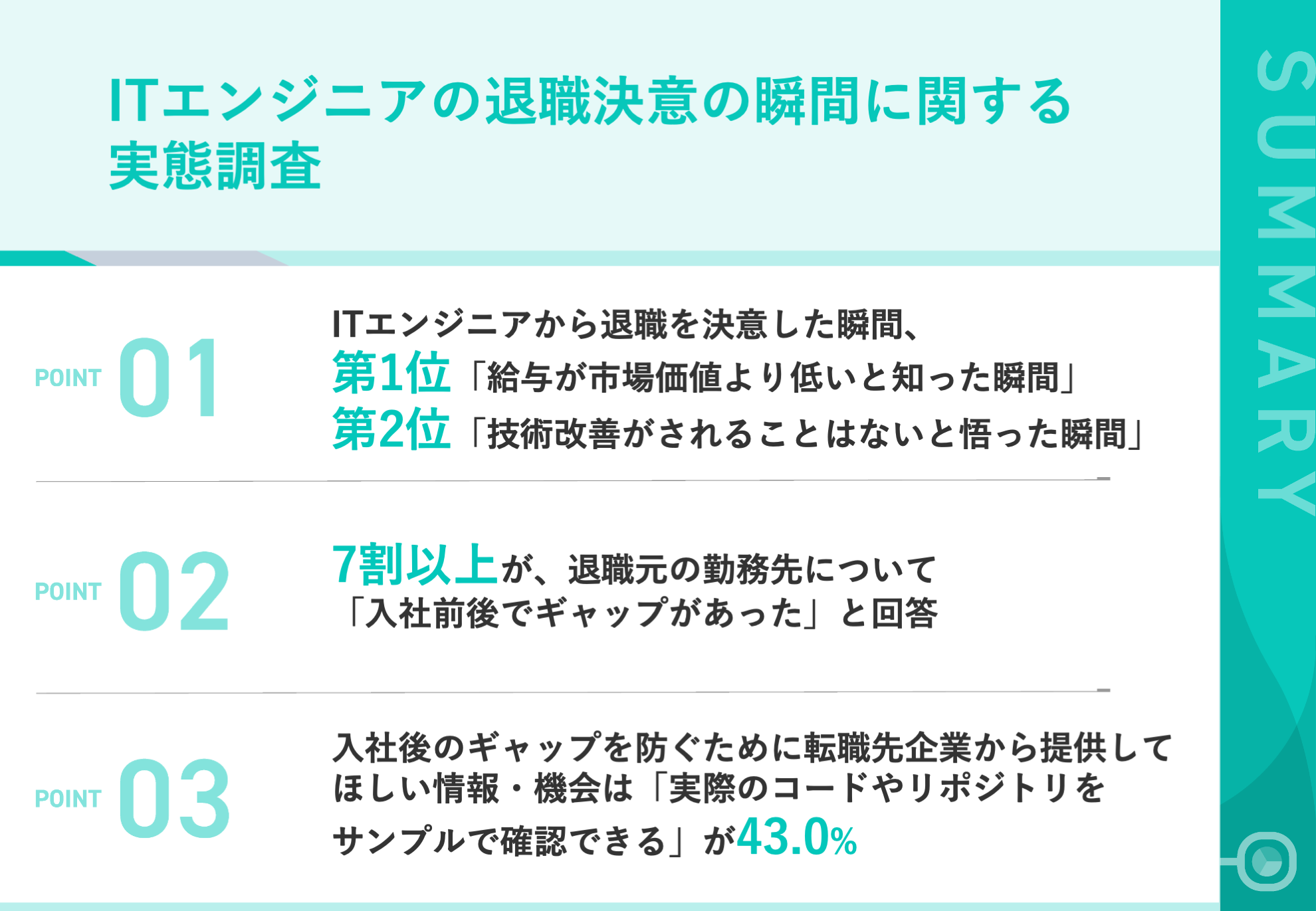 - 01|ITエンジニアから退職を決意した瞬間、第1位「給与が市場価値より低いと知った瞬間」 第2位「技術改善がされることはないと悟った瞬間」