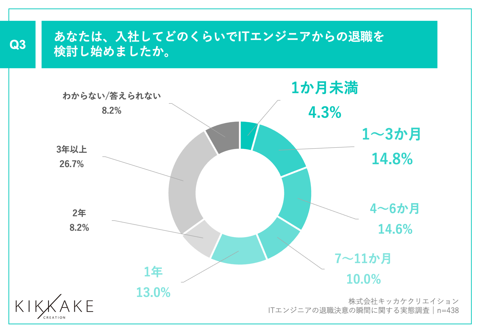 「Q3.あなたは、入社してどのくらいでITエンジニアからの退職を検討し始めましたか。」(n=438)と質問したところ、「3年以上」が26.9%、「1~3か月」が14.8%という回答となりました。