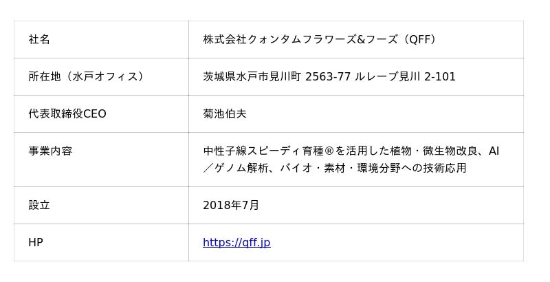 株式会社クォンタムフラワーズ&フーズ(本社:茨城県水戸市、代表取締役CEO:菊池伯夫、以下「QFF」)は、2025年10月29日(水)に東京・新宿住友ビル三角広場で開催される「住友不動産ベンチャーサミット2025」に出展いたします。本イベントでは、QFFが展開する「中性子線スピーディ育種(R)」技術の最新応用事例を通じて、バイオ・素材・環境分野を中心に、産業界との連携機会を広く創出していく所存です。