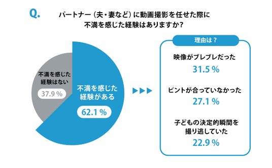 - 6割以上(62.1%)がパートナー(夫・妻など)に動画撮影を任せた際に不満を感じた経験があると回答