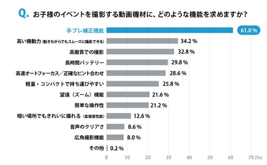 そこで、動画機材にどのような機能を求めるか尋ねたところ、ダントツで「手ブレ補正機能」が61.0%と最も高い支持を得ました。次いで「高い機動力」(34.2%)、「高画質での撮影」(32.8%)、「長時間バッテリー」(29.8%)などが続き、親たちが“失敗のない安定した撮影”を強く望んでいることが明らかになりました。