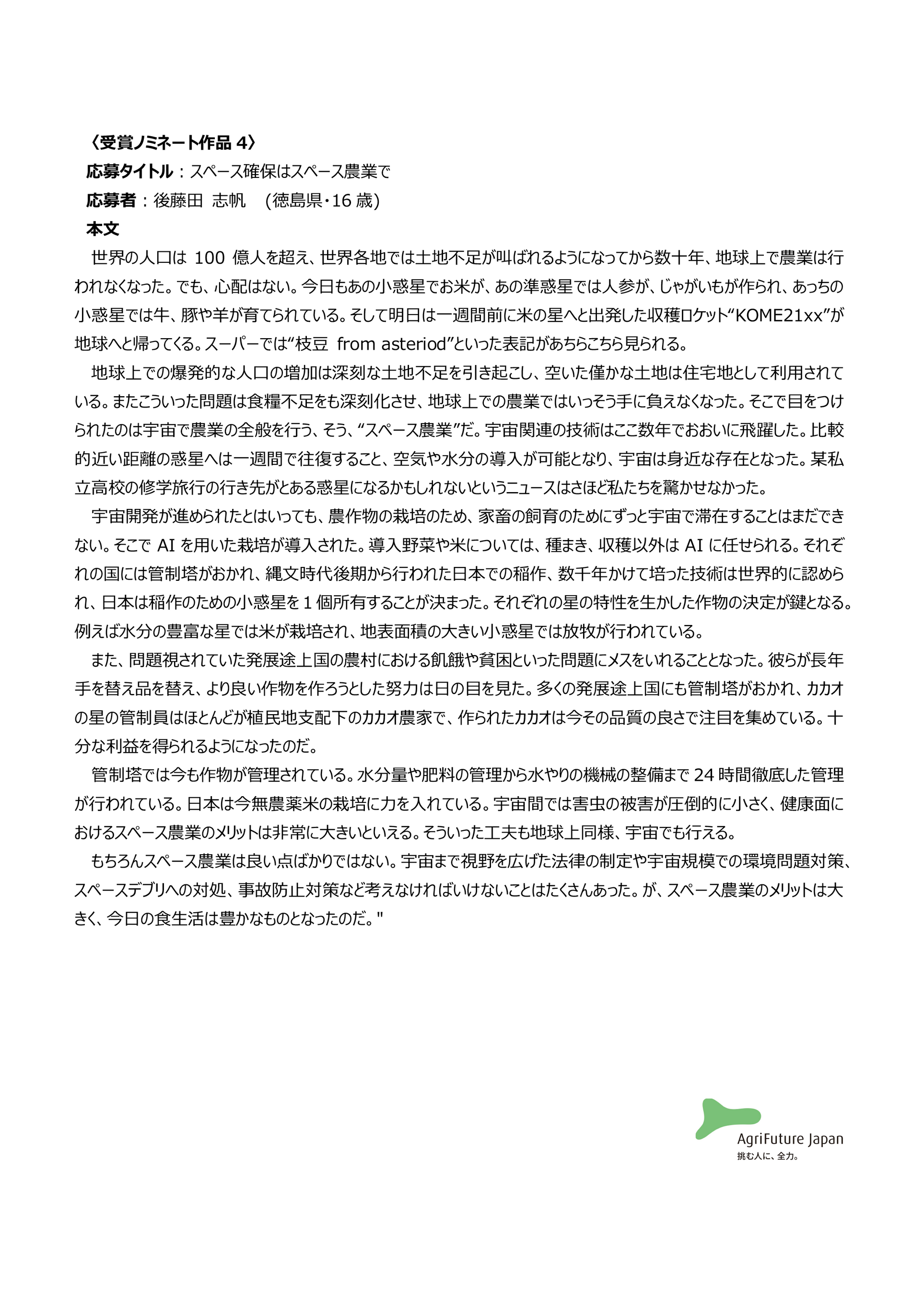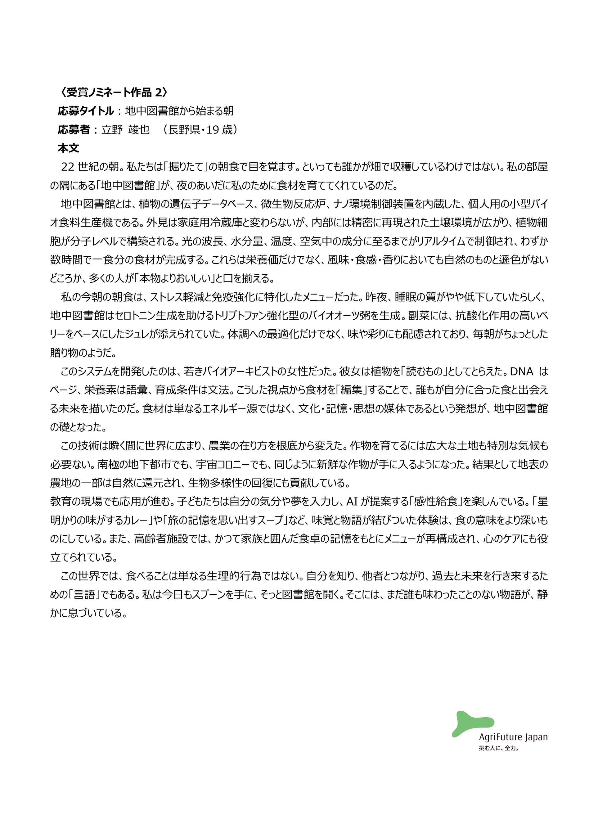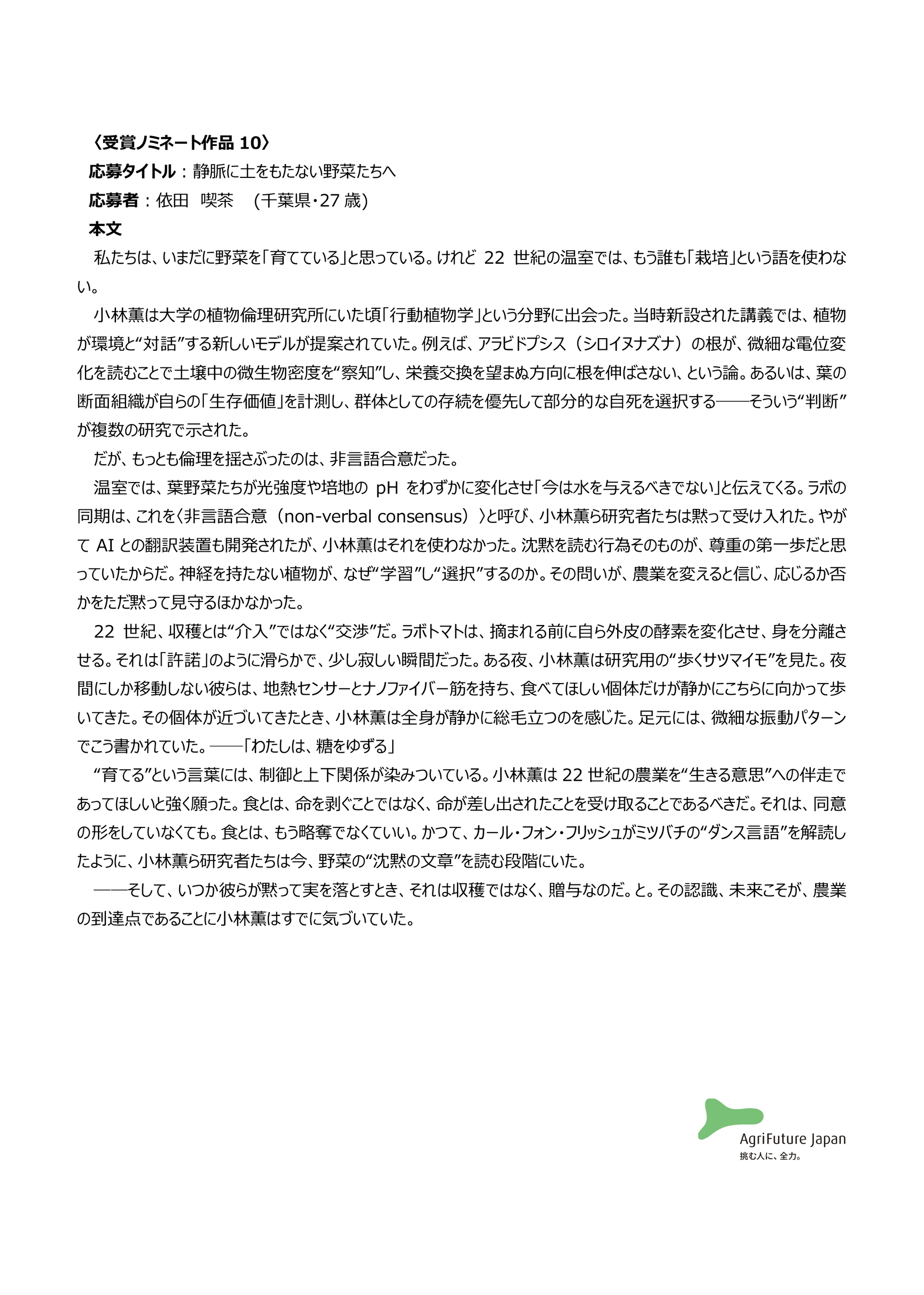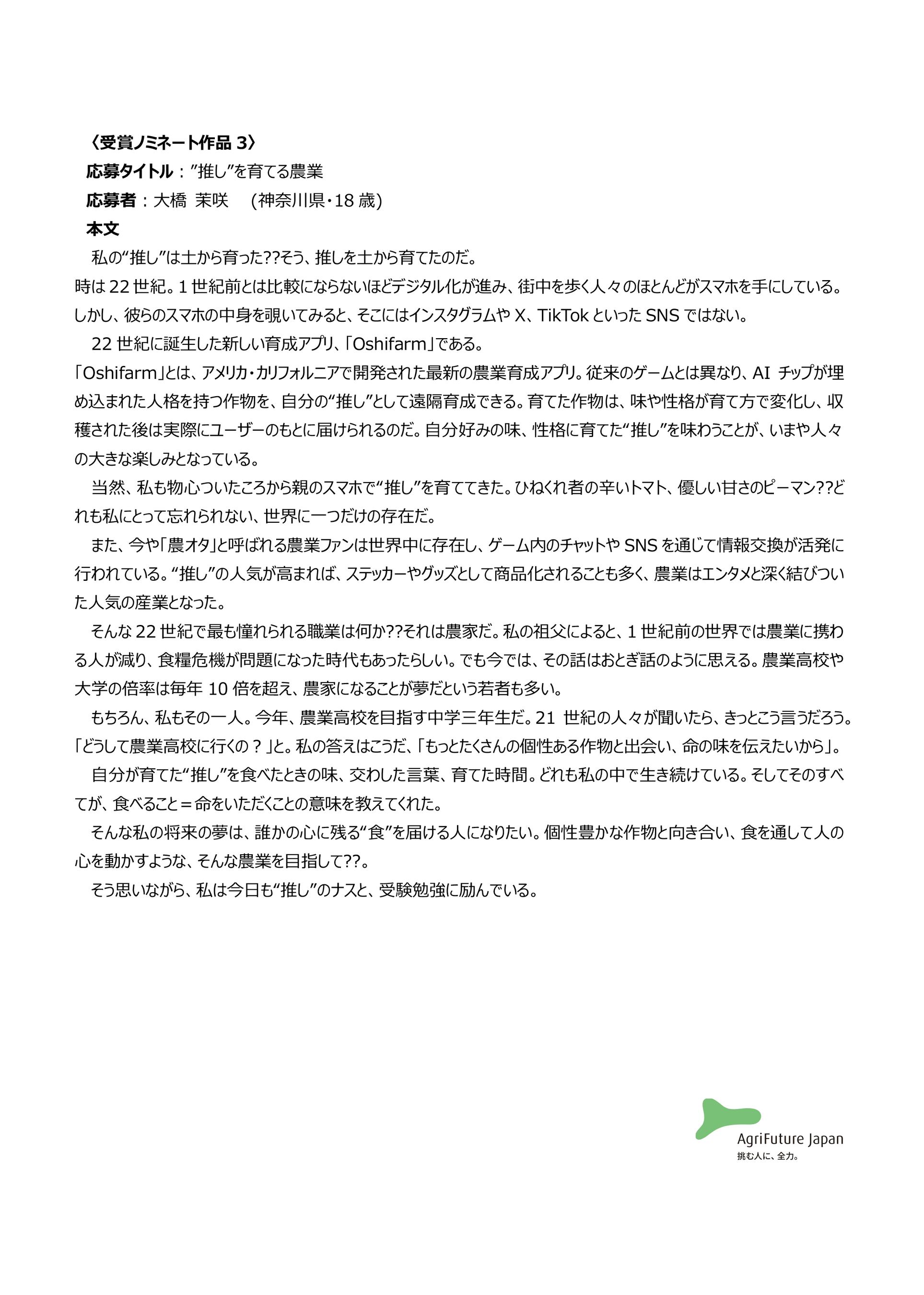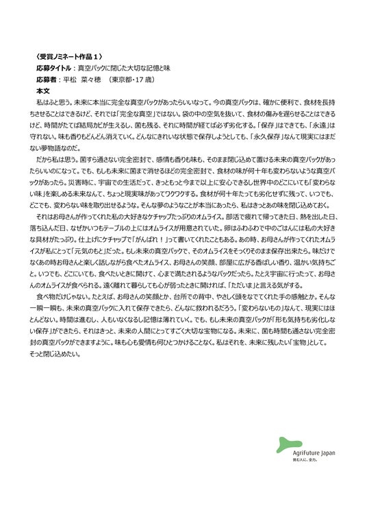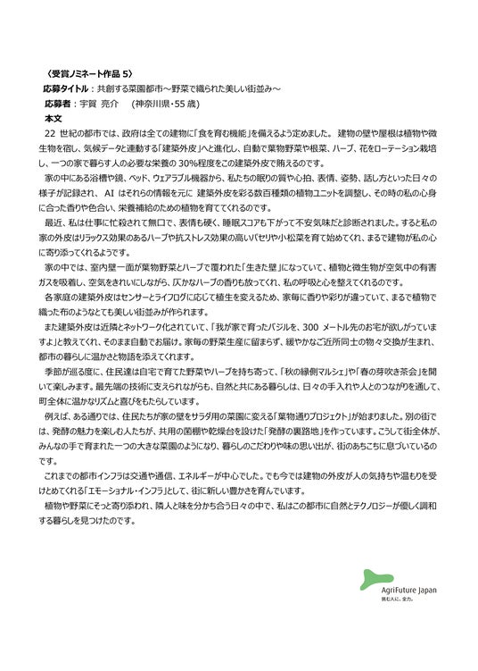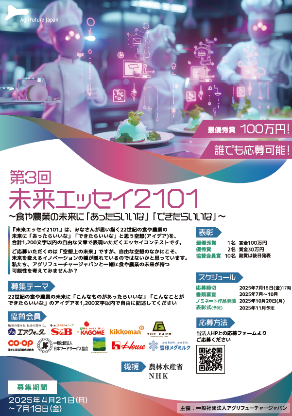 一般社団法人アグリフューチャージャパン(理事長:合瀬宏毅、東京都港区)が開催する第三回『未来エッセイ2101』 (以下、本コンテスト)の受賞ノミネート作品を選出いたしました。
