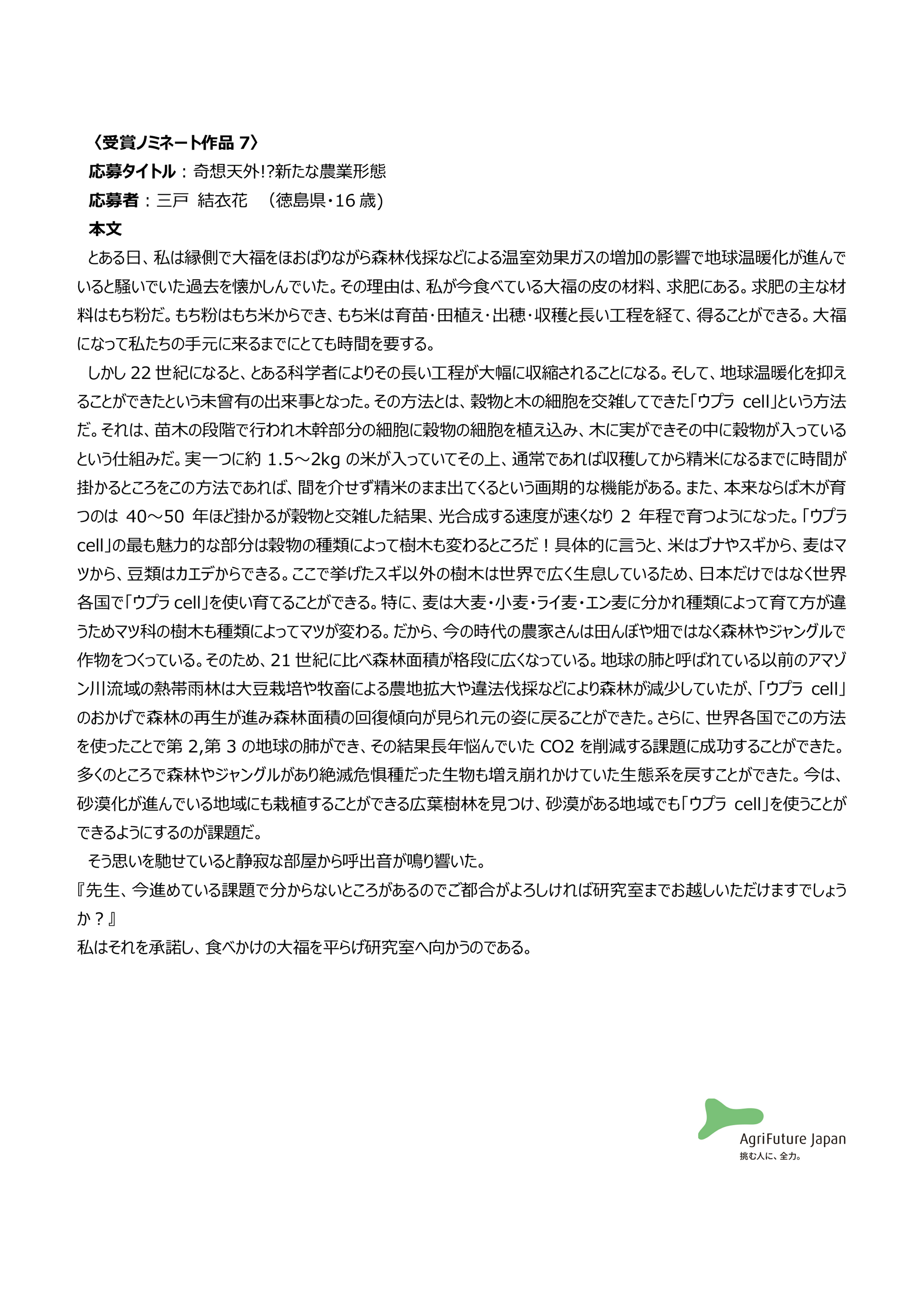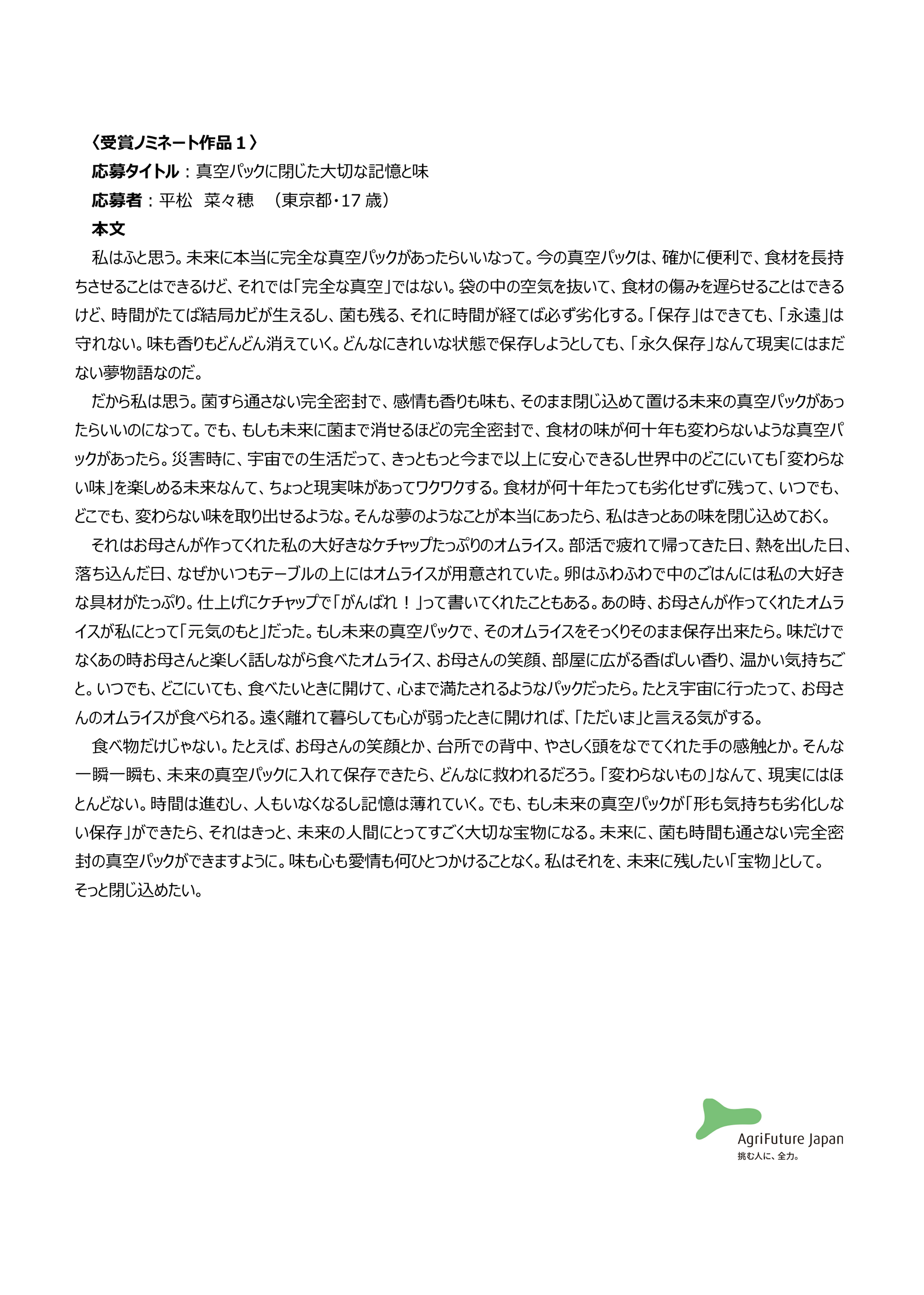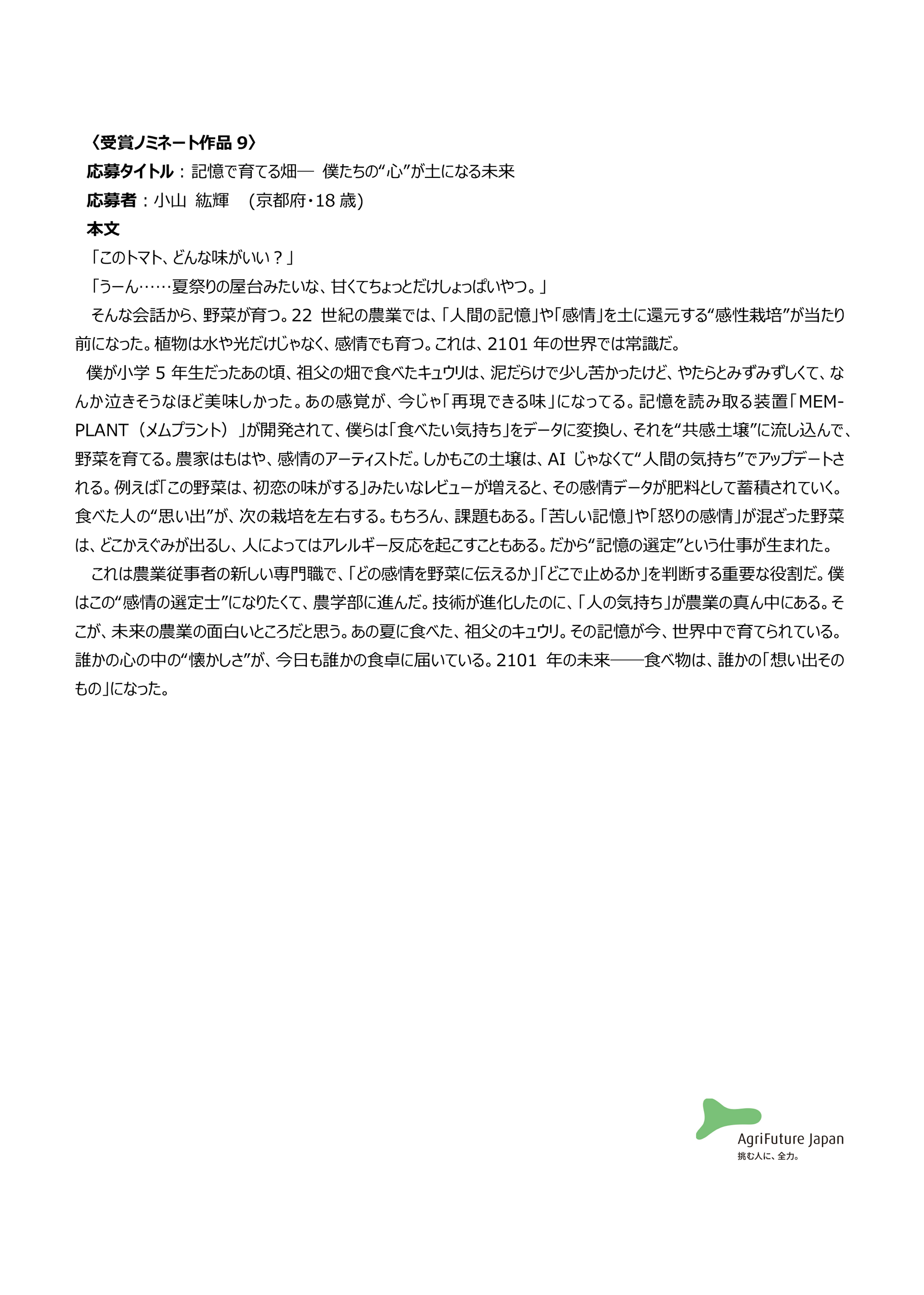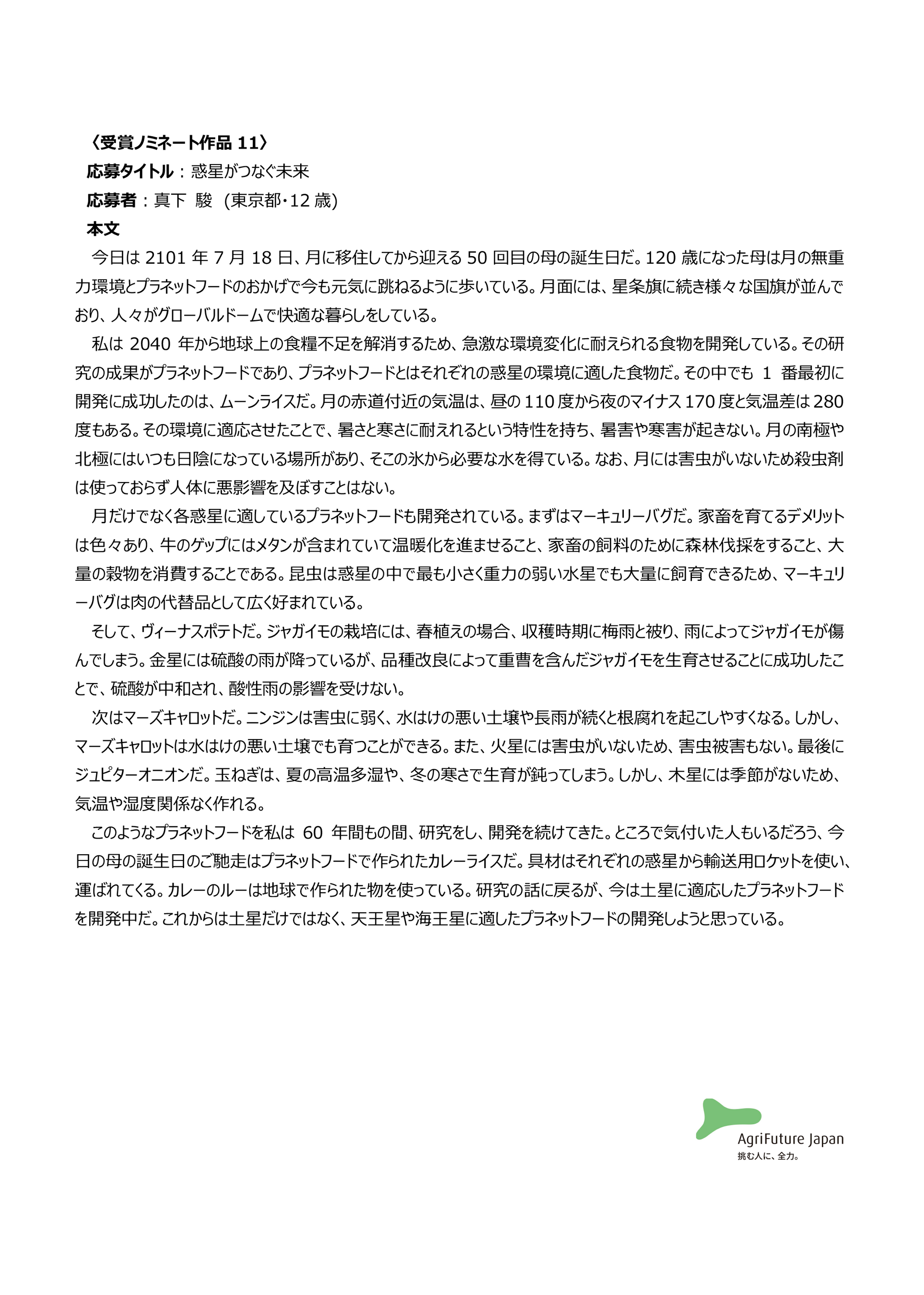 一般社団法人アグリフューチャージャパン(理事長:合瀬宏毅、東京都港区)が開催する第三回『未来エッセイ2101』 (以下、本コンテスト)の受賞ノミネート作品を選出いたしました。