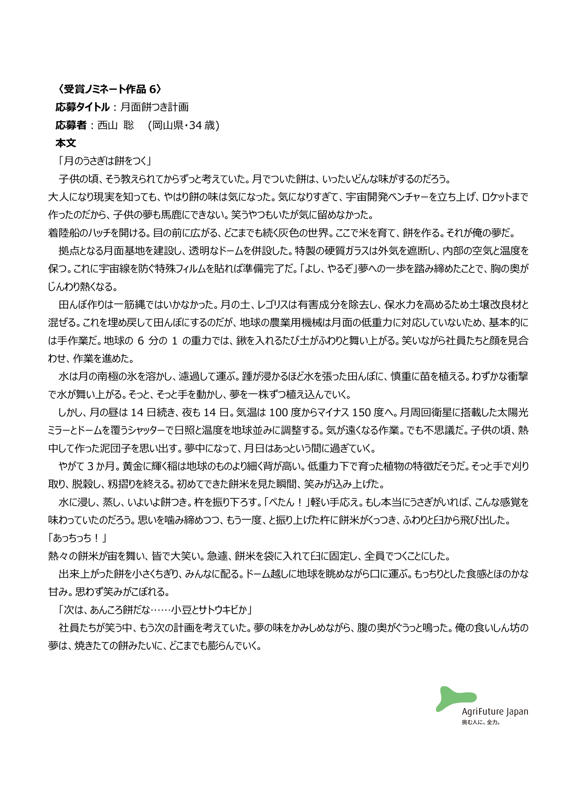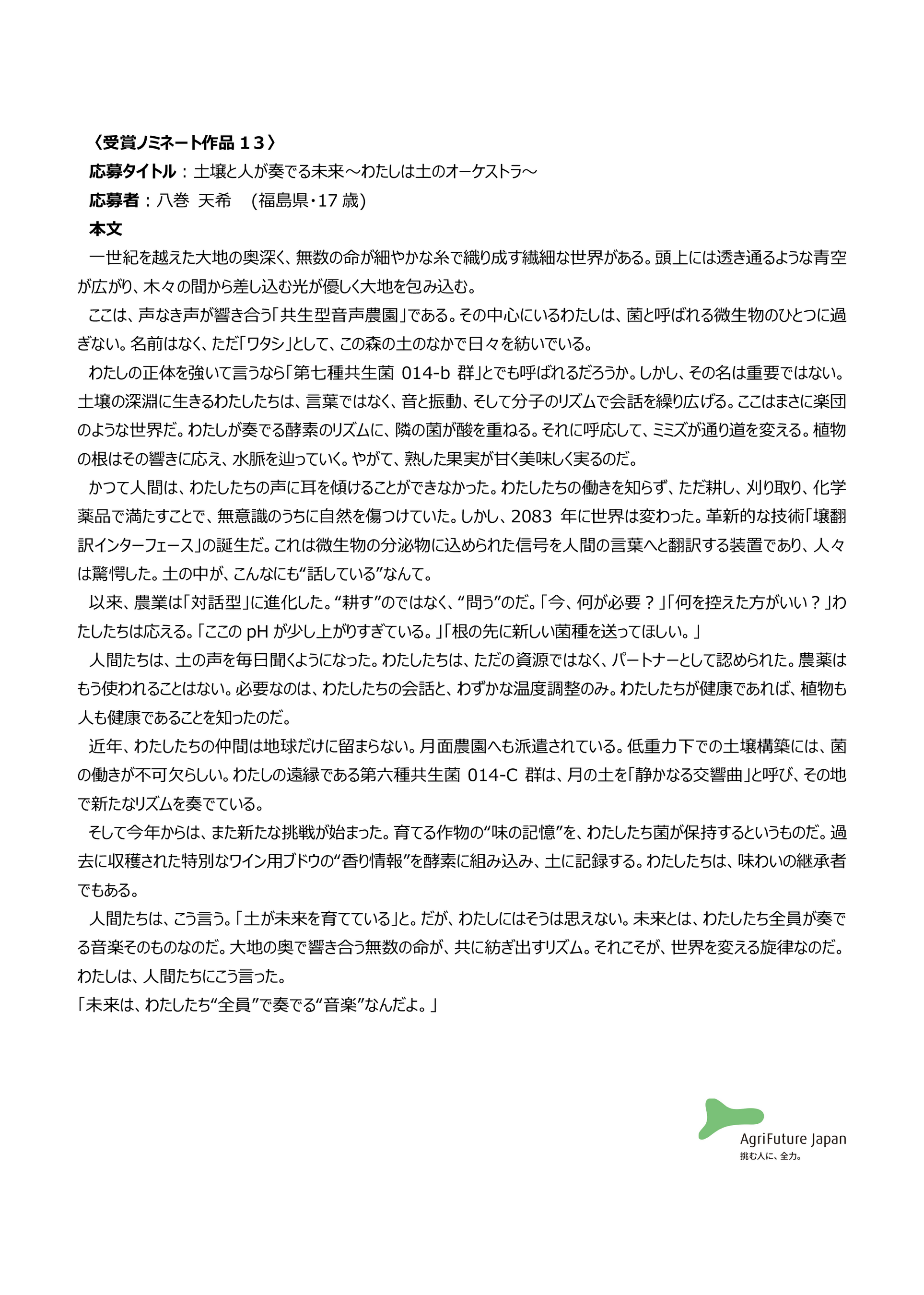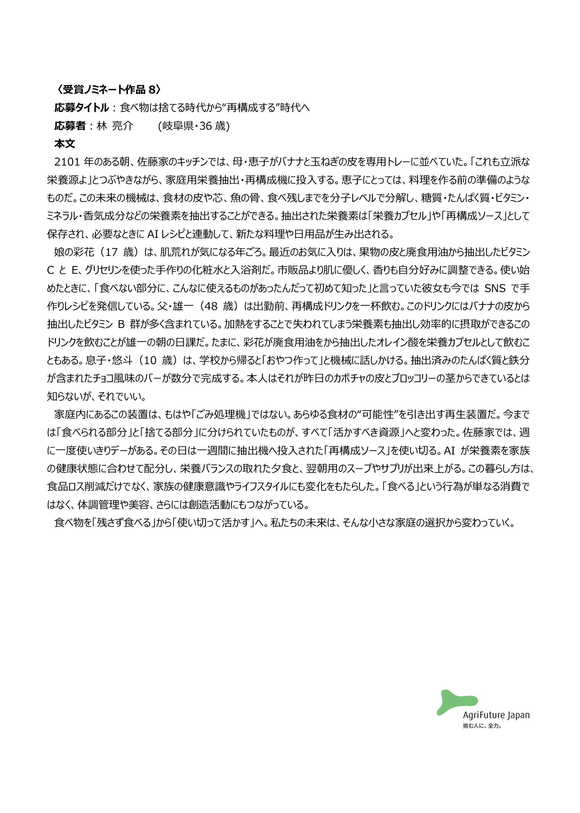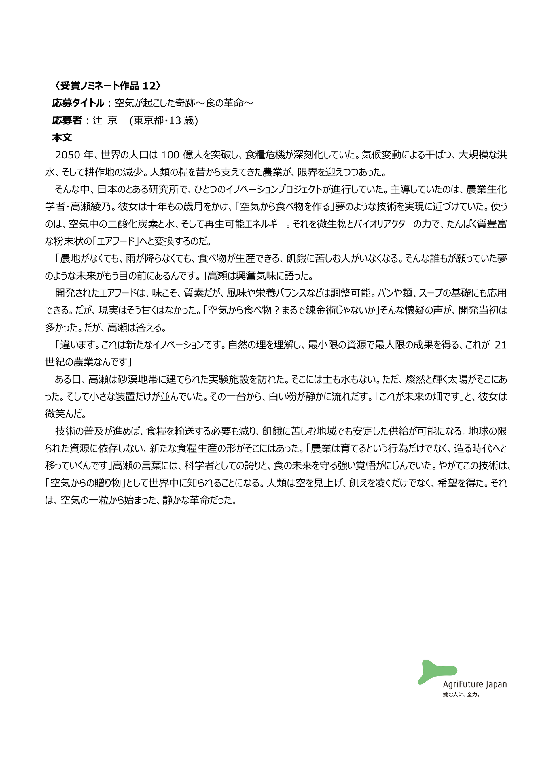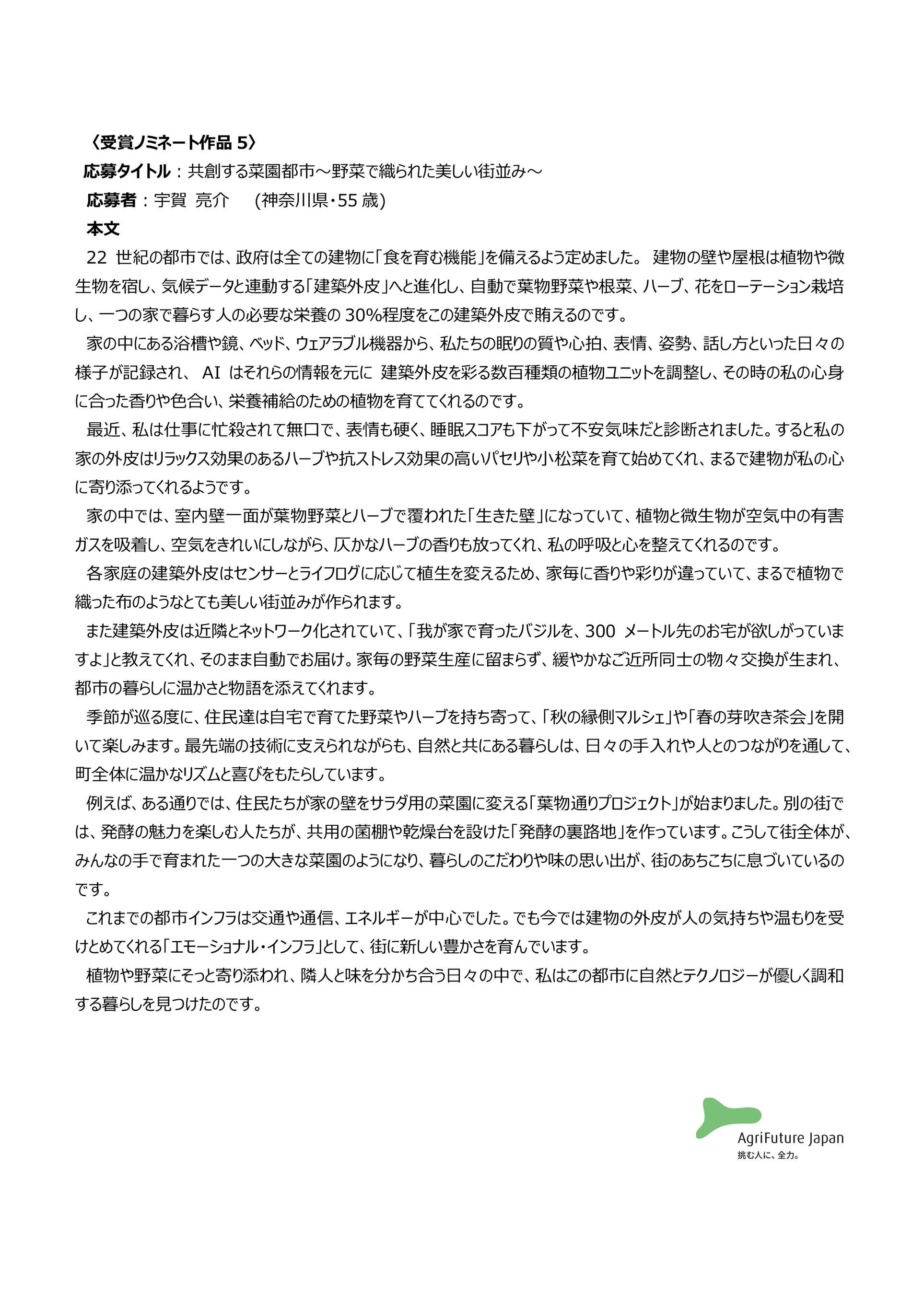 一般社団法人アグリフューチャージャパン(理事長:合瀬宏毅、東京都港区)が開催する第三回『未来エッセイ2101』 (以下、本コンテスト)の受賞ノミネート作品を選出いたしました。