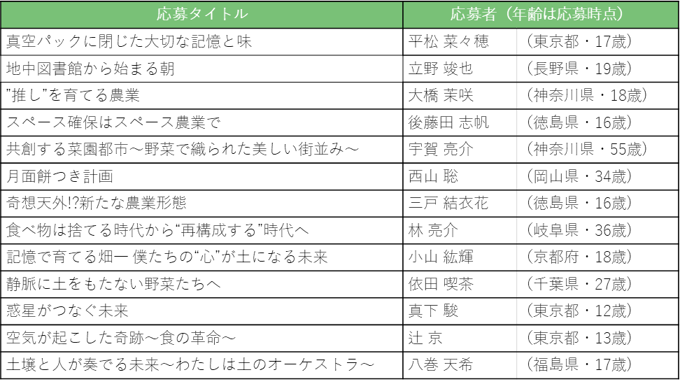 ご応募いただきました作品は、食や農業の分野でご活躍されている審査員により、厳正な審査を行った結果、「最優秀賞」1作品、「優秀賞」2作品、「協賛会員賞」10作品の受賞ノミネート作品を以下のとおり選出いたしました。