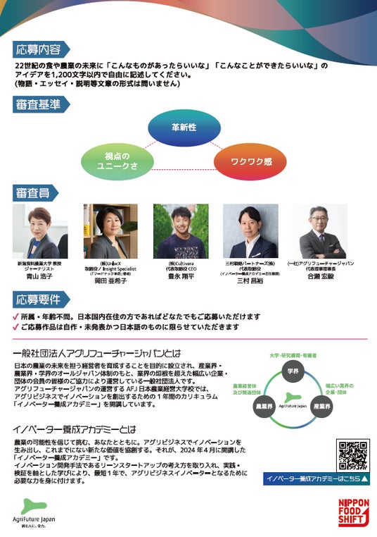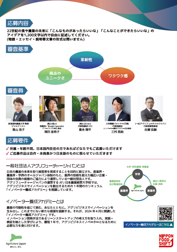 本コンテストを通じて、皆様が思い描く未来を実現するための様々なアイデアやイノベーションの種をビジネス化できる人材を育てることこそが、当法人の責務であると改めて気づかされました。また、皆様からお寄せいただいた多数のご応募に心から感謝するとともに、これからも人材育成を通じて、食や農業の未来に貢献すべく、尽力してまいります。