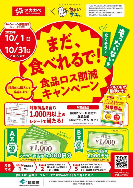 このたび、株式会社アカカベ様(本社:大阪府大東市)と共同で、食品ロス削減をテーマとしたキャンペーンを2025年10月1日から展開しています。