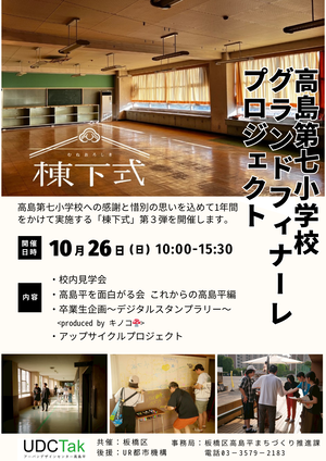 地域住民や関係団体とともに高島平地域のまちづくりを進めている板橋区は、令和7年10月26日(日)、アーバンデザインセンター高島平(以下、「UDCTak」という。)と共催で、「高島第七小学校(以下「高七小」という。) グランドフィナーレプロジェクト」に向けた「棟下式(むねおろしき)@高島第七小」第3弾イベントを開催します。