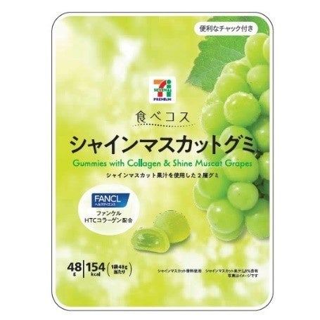 商品特長:ファンケルHTCコラーゲンを配合した、シャインマスカット果汁使用の2層のトロぷに食感グミです。
