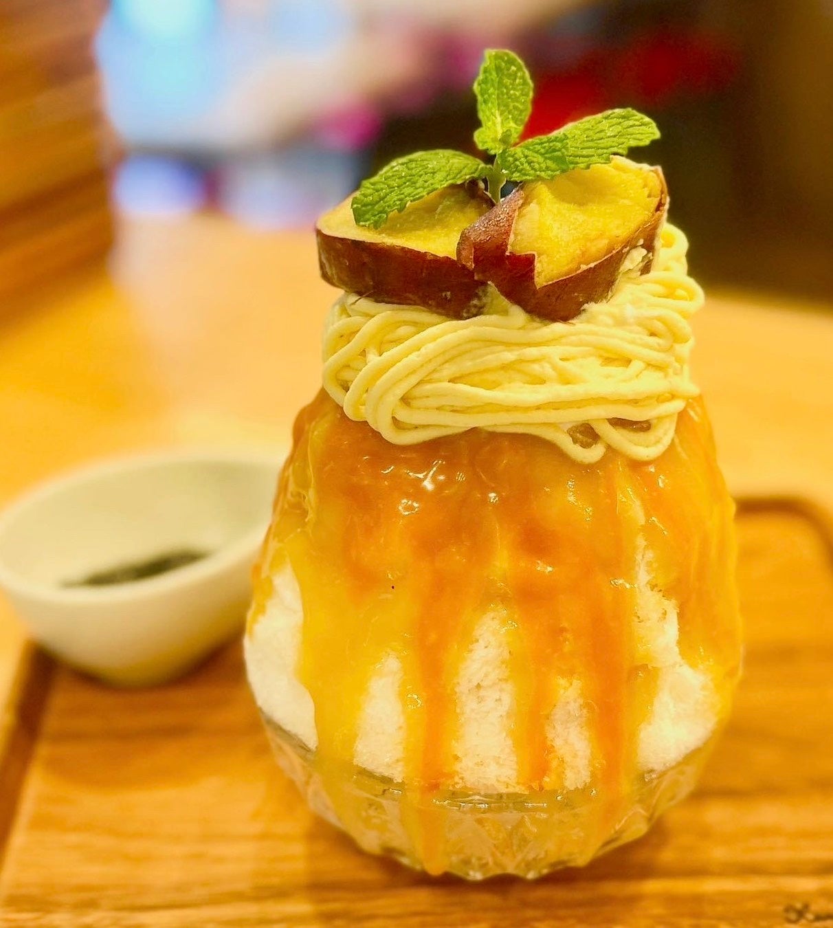 『おすすめスイーツ!?かき氷』ふわふわの富士山天然氷”極”に焼き芋シロップをたっぷりかけ、仕上げに芋モンブランを豪快にトッピングしました。香ばしさと濃厚な甘みがとろけ合い、スイートポテトのような味わいが楽しめます。ご褒美にぴったりの華やかな逸品です。
