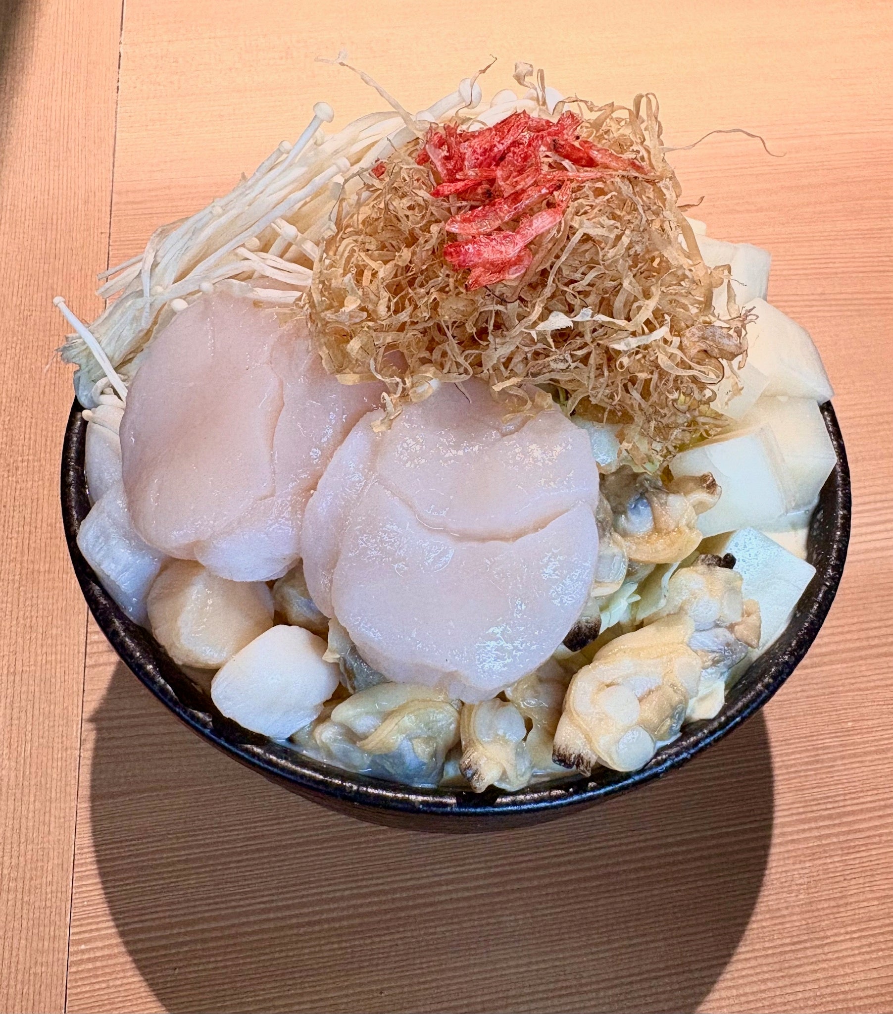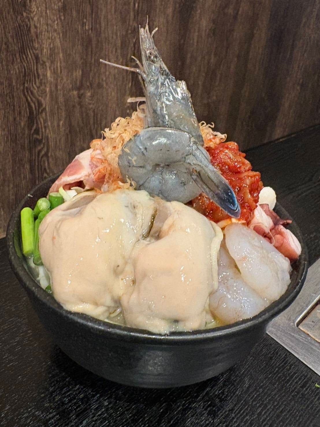 プリップリの“天使のエビ”、濃厚な“牡蠣”、旨みたっぷりの“タコ・アサリ・ホタテ”を贅沢に盛り込み、特製のピリ辛出汁とキムチがクセになる味わい。