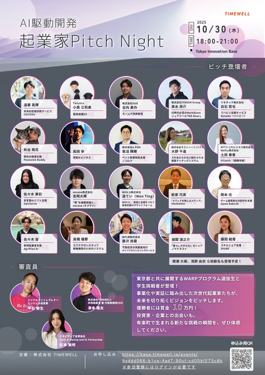 株式会社TIMEWELL(本社:神奈川県横浜市、代表取締役:濱本隆太、以下「TIMEWELL」)はAI駆動開発を実践している起業家24名によるピッチイベント「AI駆動開発 起業家Pitch Night」を2025年10月30日に有楽町 Tokyo Innovation Baseにて開催することをお知らせします。