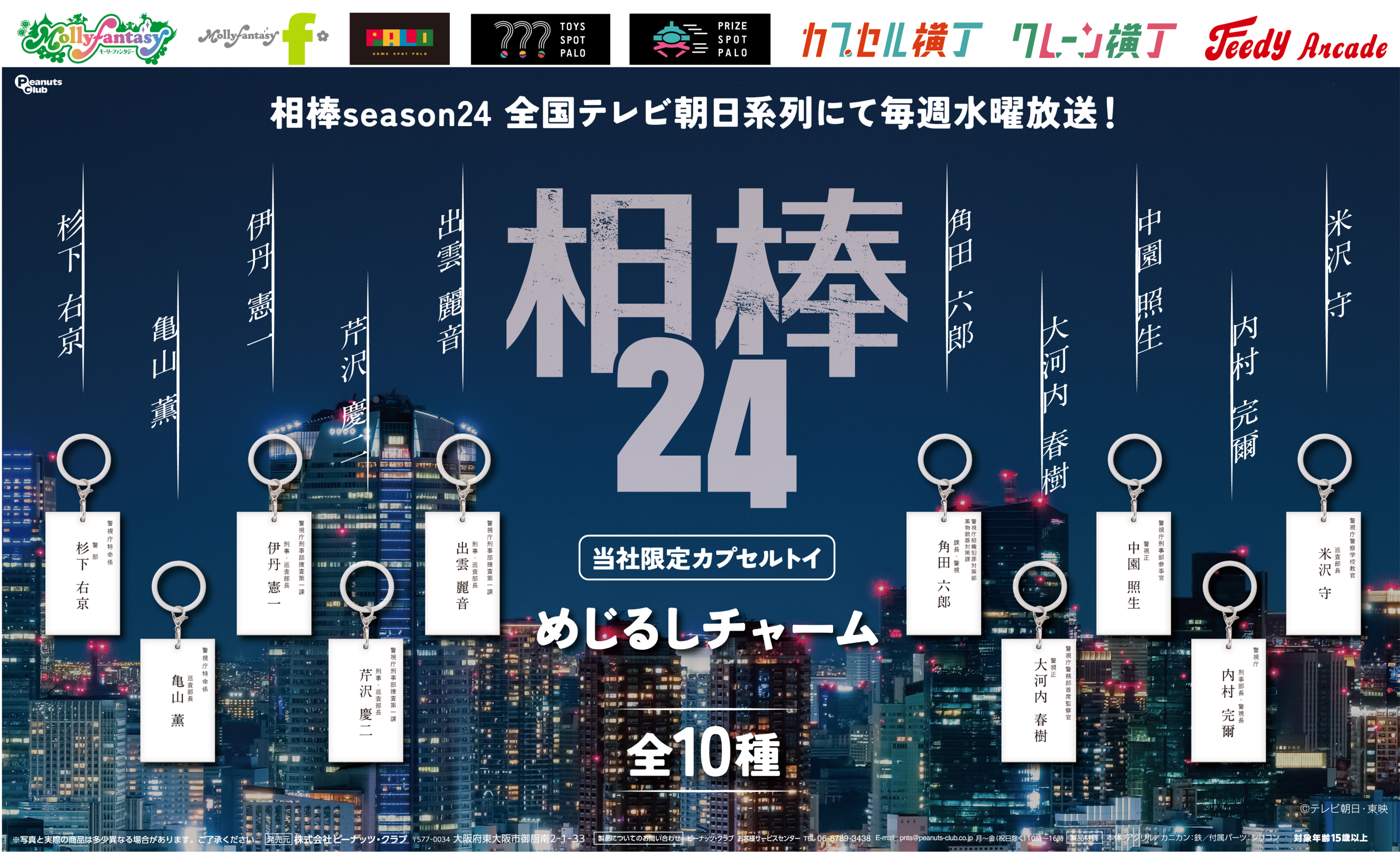 株式会社イオンファンタジー(本社:千葉県千葉市、代表取締役社長:藤原徳也、以下、当社)は、シリーズ誕生25周年を迎えるTVドラマ『相棒season24』の名刺風デザインの「相棒 めじるしチャーム」をアミューズメント施設「モーリーファンタジー」「PALO」、カプセルトイ専門店「TOYS SPOT PALO」「カプセル横丁」などに設置する当社オリジナル完全キャッシュレスカプセルトイマシン「かぷえぼ」限定のカプセルトイとして10月21日(火)より一斉発売いたします。