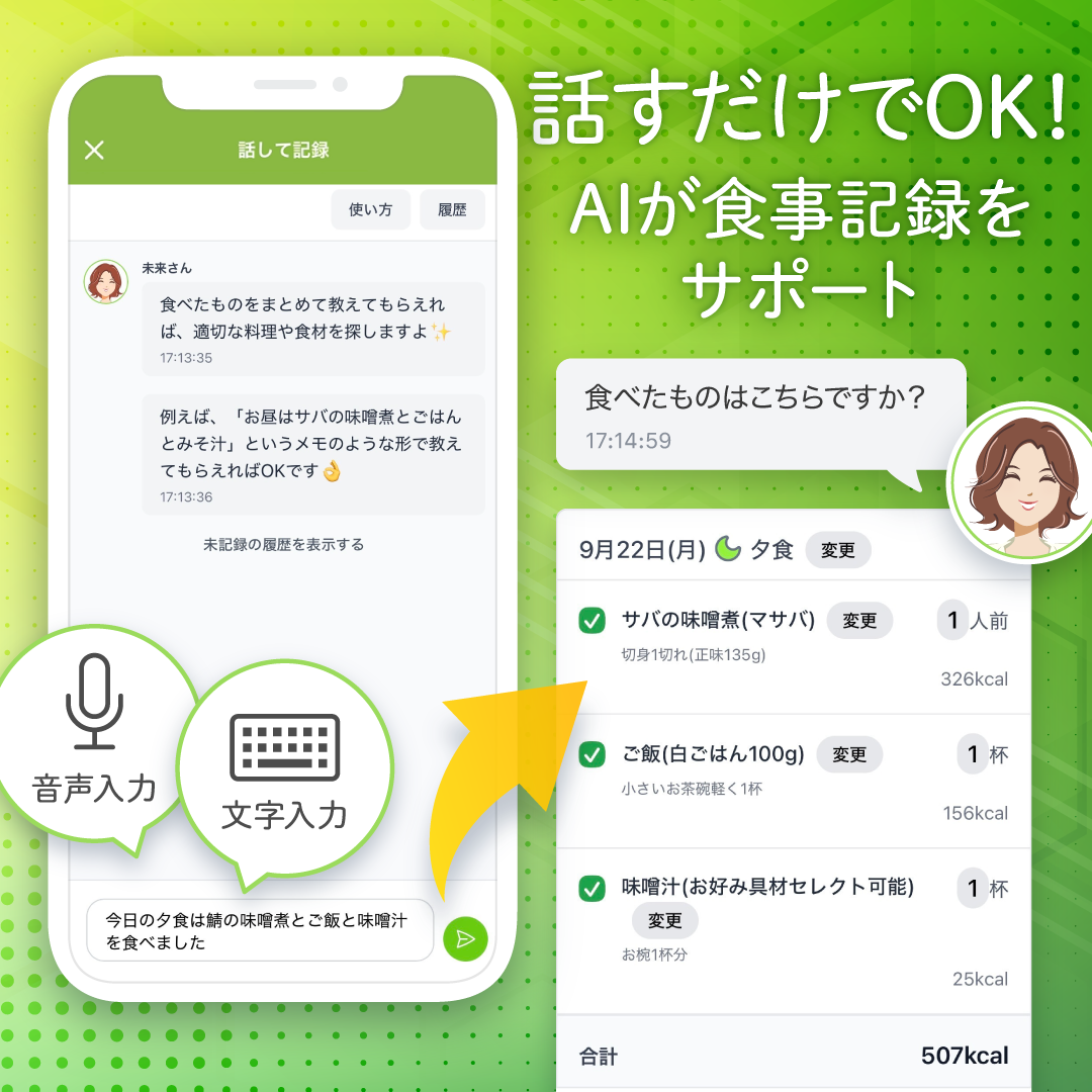 ■食事の内容を話し言葉で伝えるだけで食事記録ができる、AIを活用した新機能「話して記録」β版の提供を開始しました。本機能は「スマホの文字入力や検索が面倒」という食事管理アプリの課題を解決するために開発されました。AIがユーザーの話し言葉を認識し、あすけん栄養士キャラクターの未来さんが食事内容を確認・記録します。