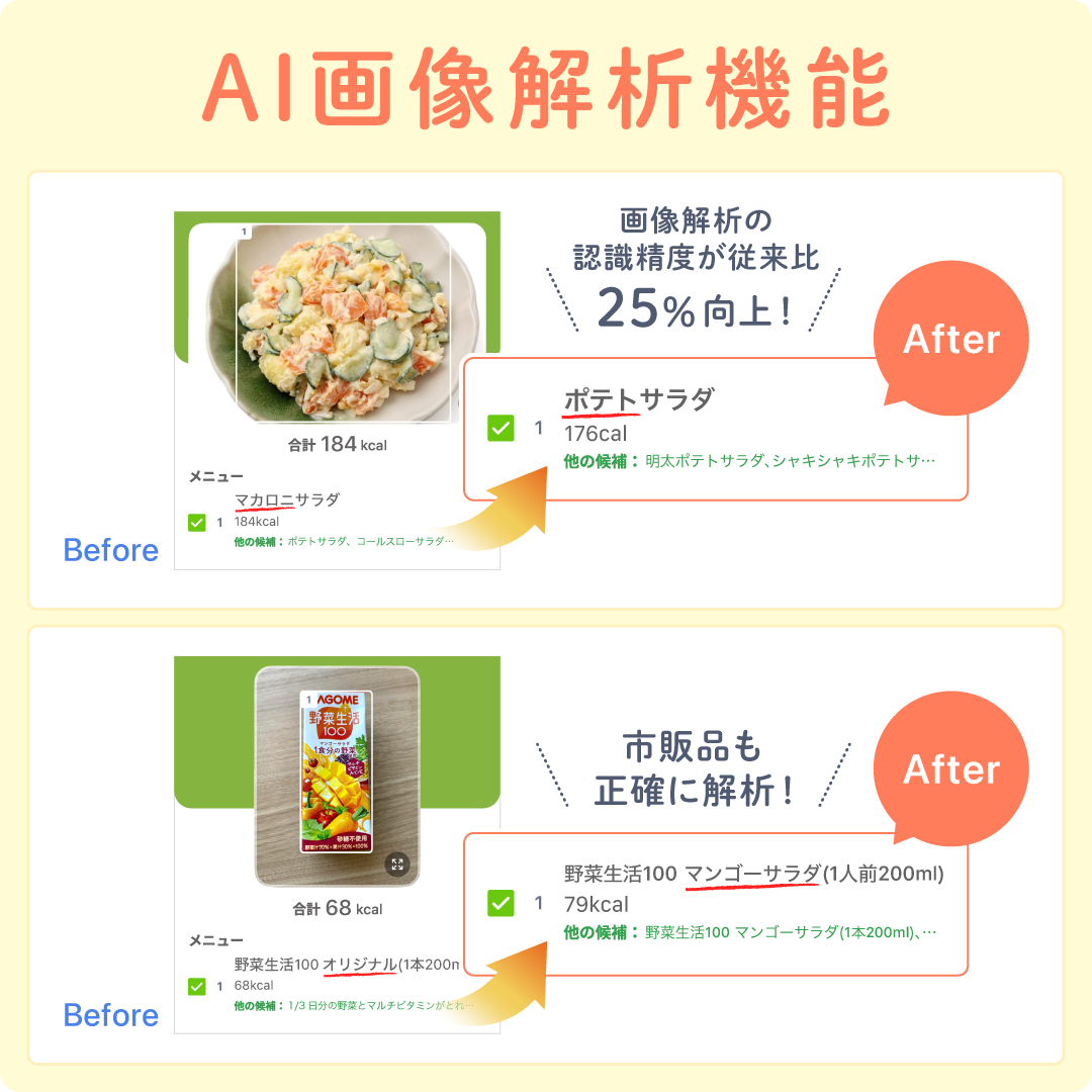 ■食事の写真を撮るだけで、自動で画像を解析し、食事メニューを判定できる『あすけん』の「AI画像解析機能」の解析精度が、AIを最適化したことにより従来比25%向上しました。さらに、市販食品の場合、食事写真から文字やロゴ情報を認識し、店名や商品名まで解析できるメニュー件数が増加しました。