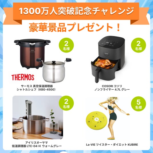 『あすけん』アプリでは、対象期間中に5日間食事記録を行った方の中から抽選で以下のプレゼントが当たる「1300万人突破記念♪食事記録5日間チャレンジ」を開催いたします。詳細は『あすけん』アプリ内「お知らせ」および「チャレンジ」をご確認ください。