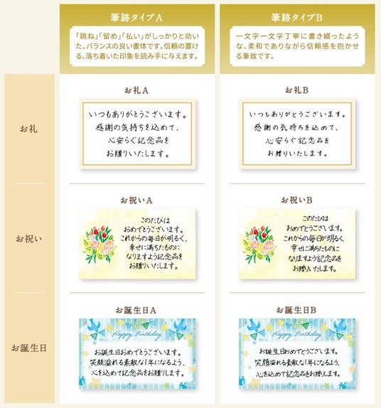 メッセージカード: 6パターン(筆跡2タイプ×用途別定型文3種)