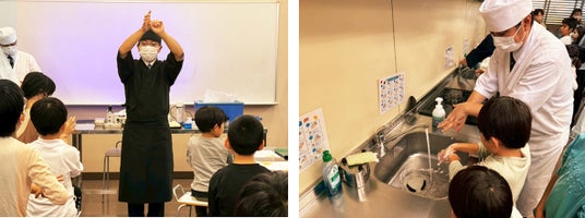 かっぱ寿司で実施している手洗いを実施。食品を扱う際の衛生管理の重要性を学びながら、丁寧に手を洗いました。