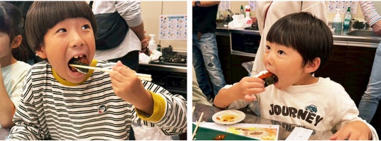 今回は、まぐろ、サーモン、たまごといった人気のにぎりに加え、いくら(軍艦)とえびてまりの計5貫を作りました。自身でにぎったお寿司を食べ、「おいしかっぱ!」と笑顔が溢れていました。