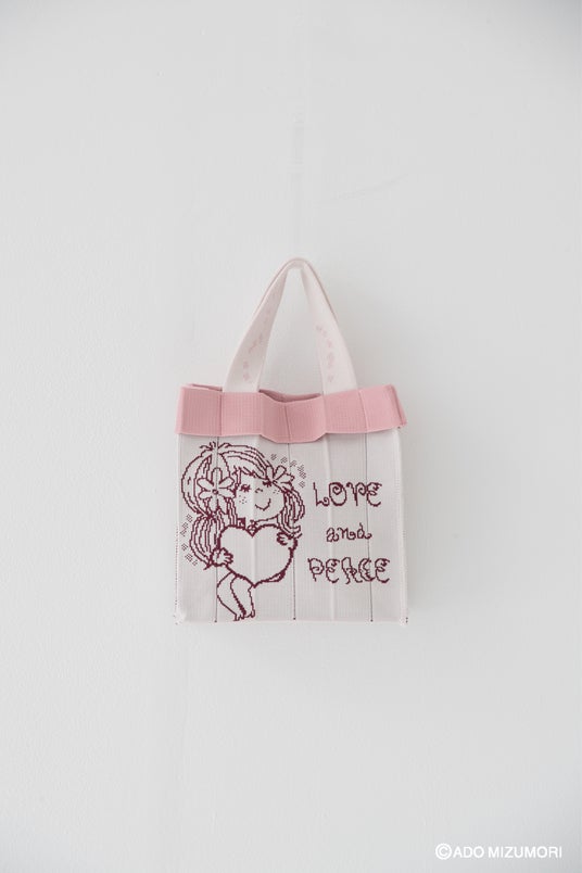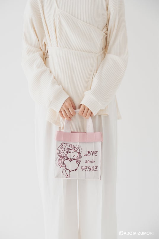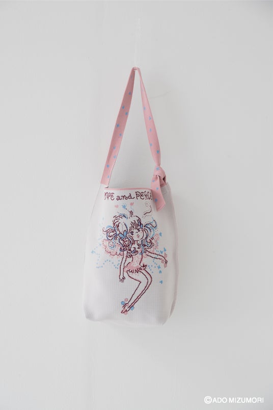 やわらかなピンクのショルダーに、水森亜土らしいガーリーで自由なイラストをあしらった「Fourty」。