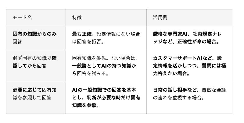 AIキャラクターの設定画面で、以下の3つのモードから、知識の参照方法を選択できるようになりました。これにより、キャラクターの役割や用途に応じた賢さのバランスを柔軟に設定できます。