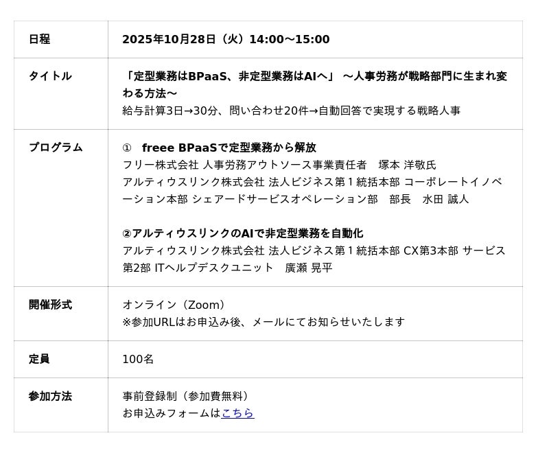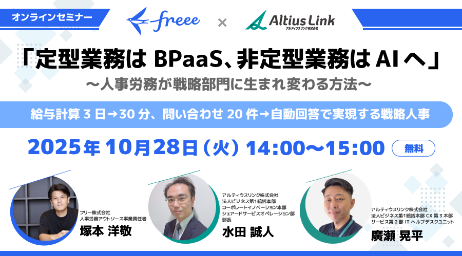 アルティウスリンク株式会社(所在地:東京都渋谷区、代表取締役社長:那谷 雅敏、以下 アルティウスリンク)は、フリー株式会社(本社:東京都品川区、CEO:佐々木 大輔、以下 freee)と、2025年10月28日(火)に共催オンラインセミナー「 『定型業務はBPaaS、非定型業務はAIへ』 ~人事労務が戦略部門に生まれ変わる方法~」を開催します。