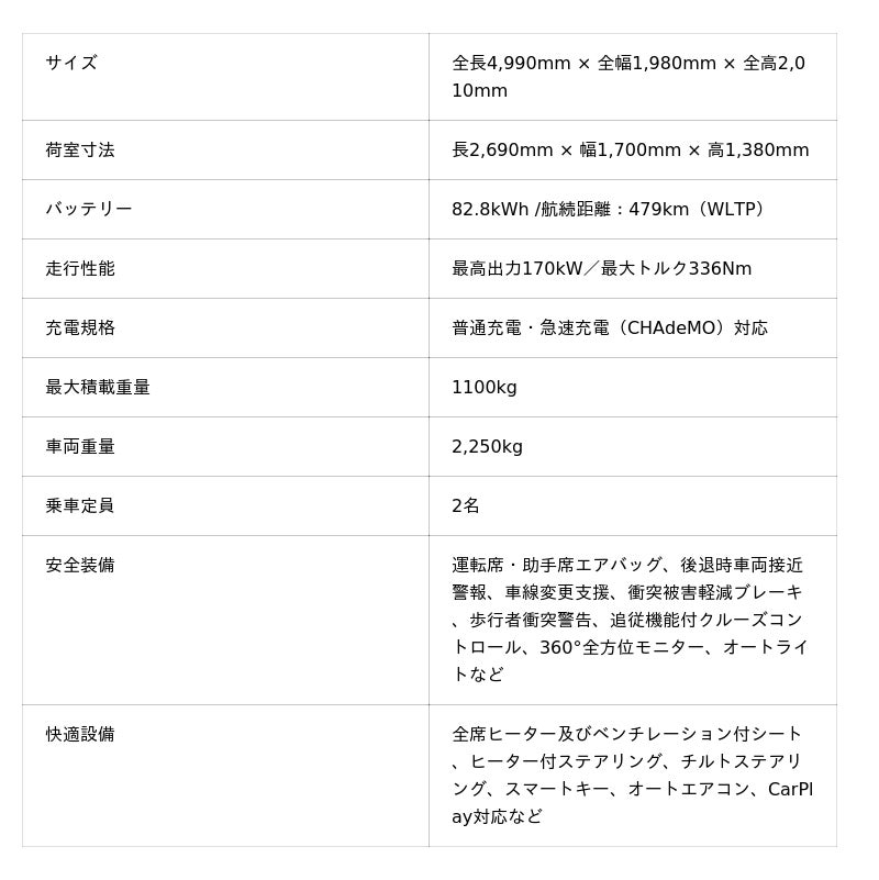 Geely Holding GroupのFarizon社との提携により実現した、積載量1トンクラスのEVバンです。CHAdeMO急速充電に対応し、快適な運行をサポートする追従機能付きクルーズコントロールや、駐車時に安心な360°全方位モニターなどの安全装備が充実。またシートヒーターやベンチレーションなど多くの快適性能も盛り込まれています。