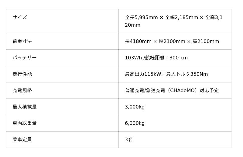 車両総重量6トン、最大積載量3トンの都市部配送に特化したモデル。EV特有のパワフルなトルク感かつ、静粛性で荷待ち時のドライバーの負担を準中型免許以上で運転可能。
