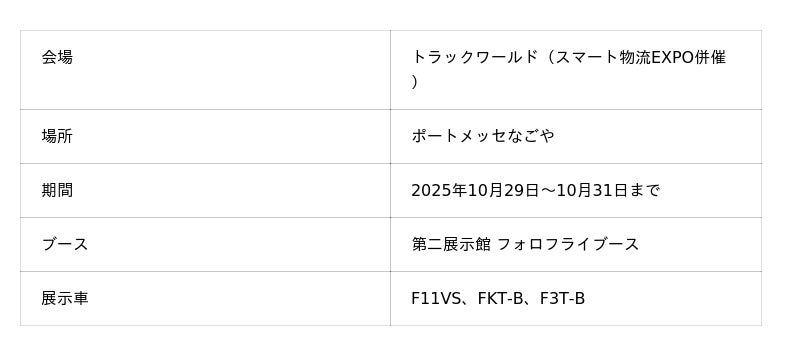 商用電気自動車(EV)メーカーのフォロフライ株式会社(本社:京都市下京区、代表取締役:小間裕康)は、2025年10月より開催される「Japan Mobility Show 2025(以下、JMS2025)」(東京ビッグサイト)および「トラックワールド」(ポートメッセなごや)において、新たにラインアップする商用EV 3車種を同時発表します。