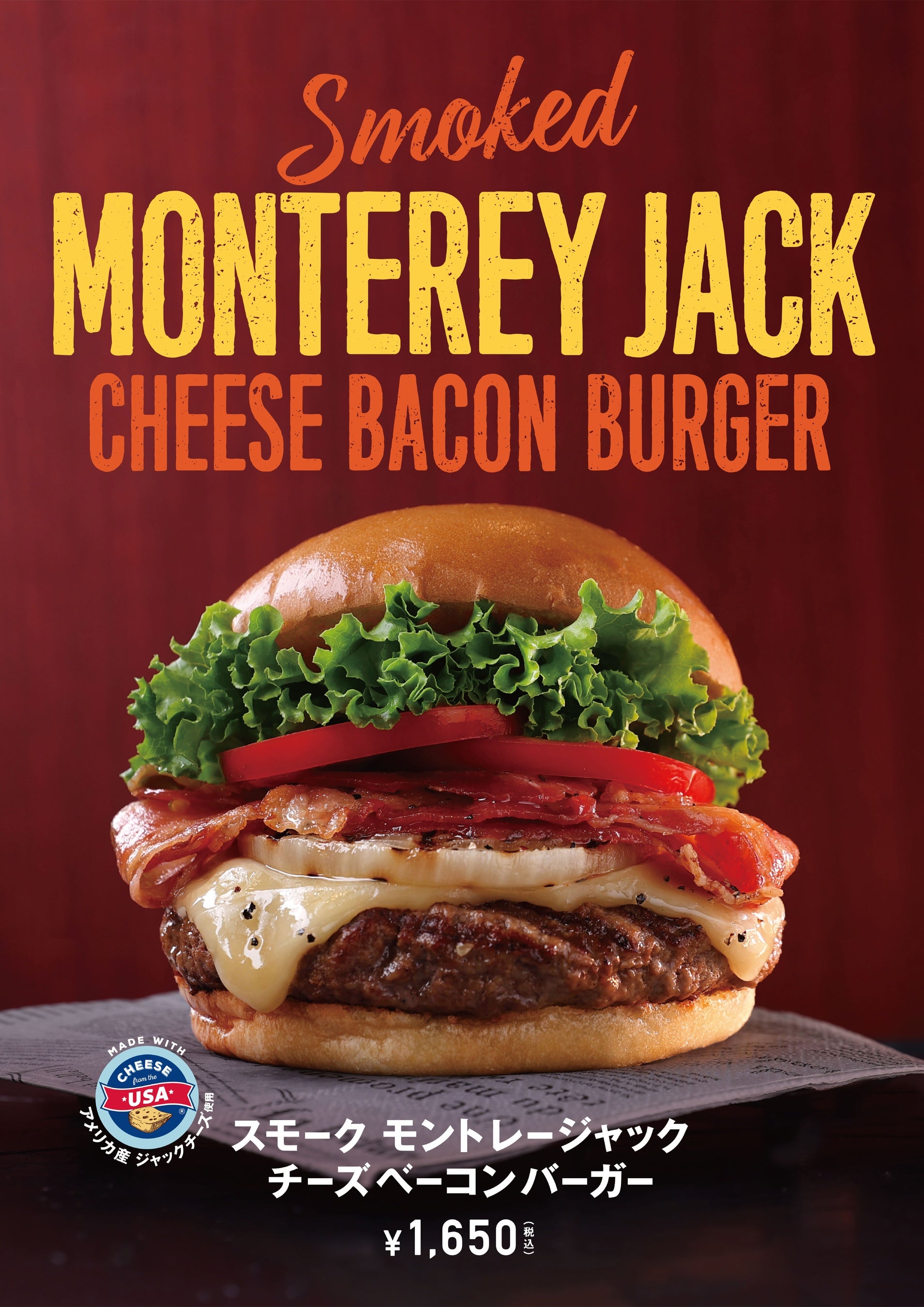 大人気のスモークチーズに燻製づくしの食材を重ねた『スモーク モントレージャックチーズ ベーコン バーガー』