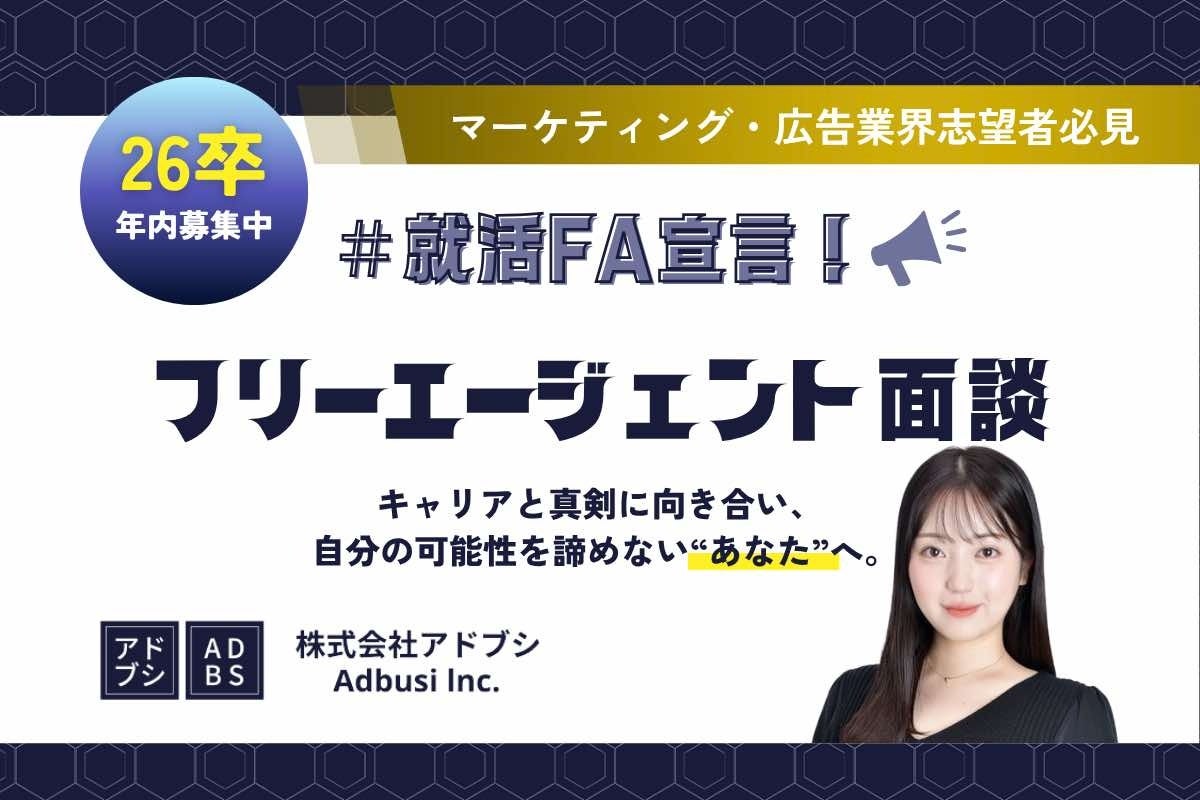 BtoBマーケティングコンサルティングを手がける株式会社アドブシ(本社:東京都新宿区、代表取締役:関口典史)は、2026年3月卒業予定の学生を対象に、「フリーエージェント面談」の受付を本日より開始いたしました。