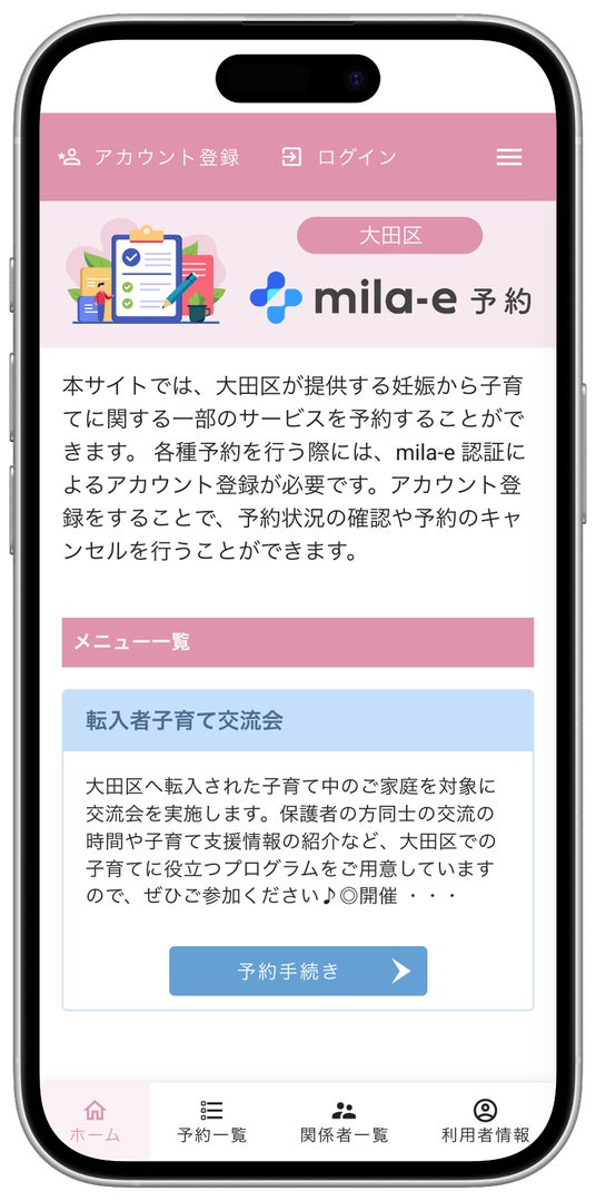 mila-e おやこ手帳 TOP画面の「各種予約」からアクセス後、お持ちのmila-e 認証アカウントにてログイン、利用者情報を入力し予約を行ってください。