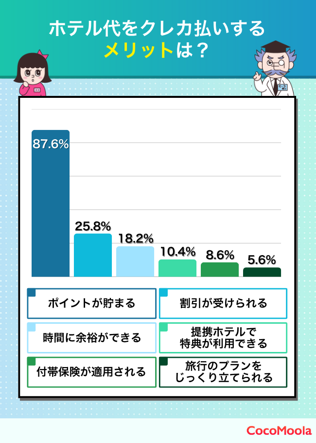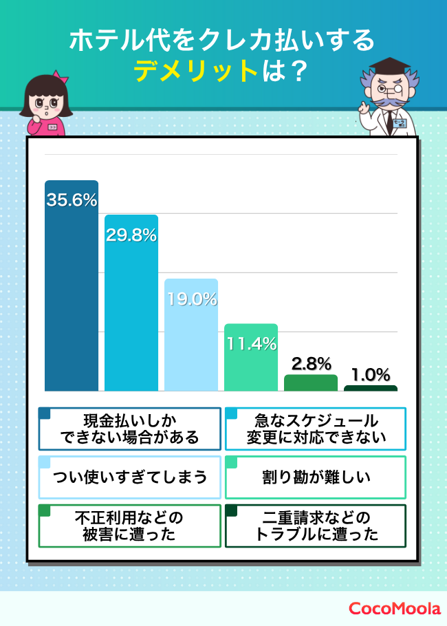 - ホテル代をクレジットカードで支払う際に感じたメリットの第1位は「ポイントが貯まる」、第2位は「割引が受けられる」。反対にデメリットの第1位は「現金払いしかできない場合がある」、第2位は「急なスケジュール変更に対応できない」。