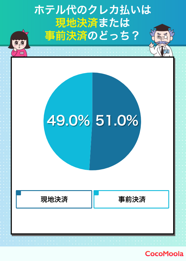 - ホテル代をクレジットカード支払う際に利用する決済方法は「現地決済」が51%、「事前決済」が41%で大きな差は見られない。