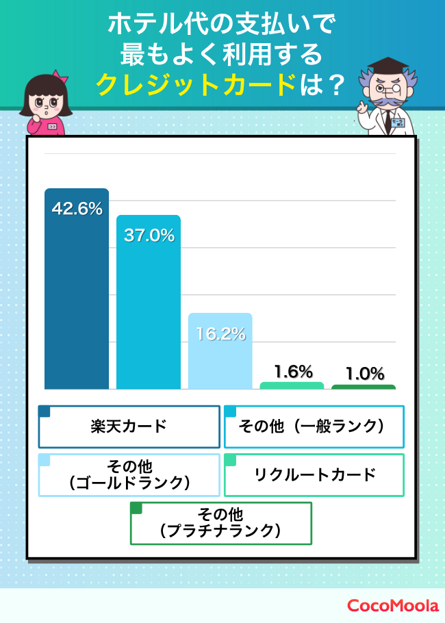 - ホテル代の支払いで最もよく利用されているクレジットカードは「楽天カード」で、全体の約43%を占める。
