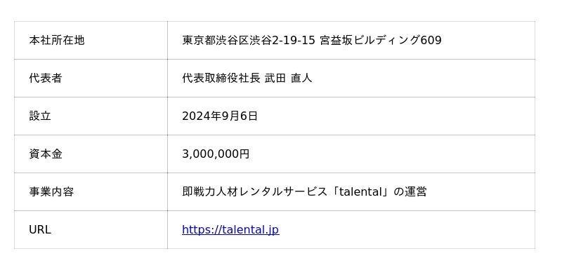 当社は、“変革を起こす、火種となる。”という経営理念を掲げ、BizDev領域に特化した副業・フリーランス人材のレンタルサービス「talental(タレンタル)」を提供しています。2024年9月の設立以来、中小企業やスタートアップの事業開発を多数支援してまいりました。