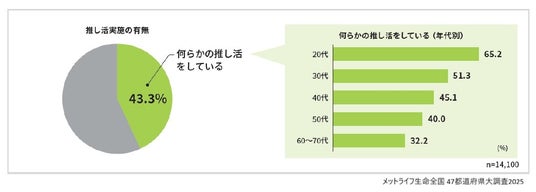 全体の4割が応援する「推し」がいると回答。若年層ほど推し活をしている割合が高く、20代では65.2%が推し活をしています。
