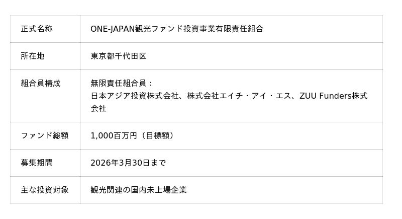 株式会社エイチ・アイ・エス(本社:東京都港区 代表取締役社長:矢田素史 以下、HIS)は、日本アジア投資株式会社(本社:東京都千代田区 代表取締役社長執行役員CEO:丸山俊)、ZUU Funders株式会社(本社:東京都港区 代表取締役:冨田和成)と共同で「ONE-JAPAN 観光ファンド投資事業有限責任組合」(以下、観光ファンド)を設立しました。