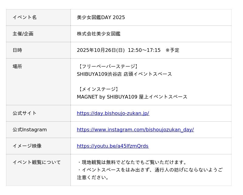 株式会社美少女図鑑(東京都渋谷区、代表取締役:中村孔亮)が運営する地域密着型メディア『美少女図鑑』は、全国各地の美少女図鑑モデルが集結する1DAYイベント「美少女図鑑DAY 2025」を2025年10月26日(日)にSHIBUYA109渋谷店 店頭イベントスペースならびにMAGNET by SHIBUYA109 屋上イベントスペースにて開催します。