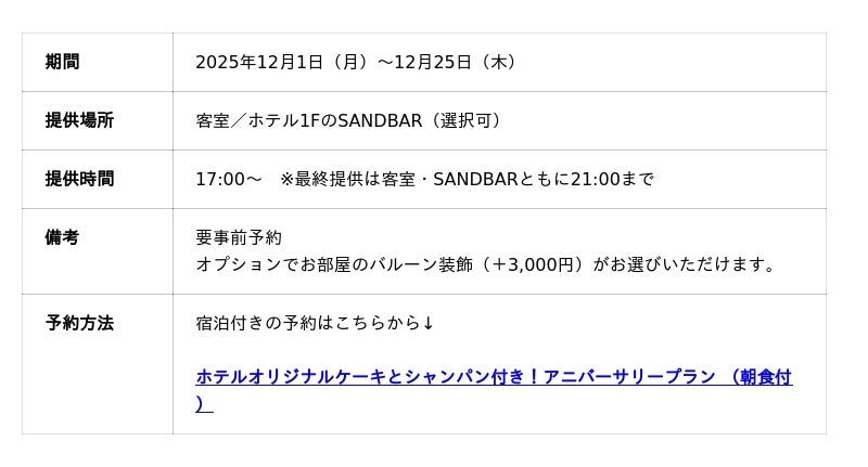 シマダグループ(本社:東京都渋谷区、代表:島田成年)の一社であるシマダハウス株式会社が運営する「葉山うみのホテル」(神奈川県三浦郡葉山町)では、ご宿泊のお客様に人気のアニバーサリープラン(ケーキとシャンパンのセット)が期間限定でクリスマス仕様に。ホテルのロゴやクリスマスツリーをかたどったアイシングクッキーで彩られたケーキとともに、特別なひとときをお過ごしください。