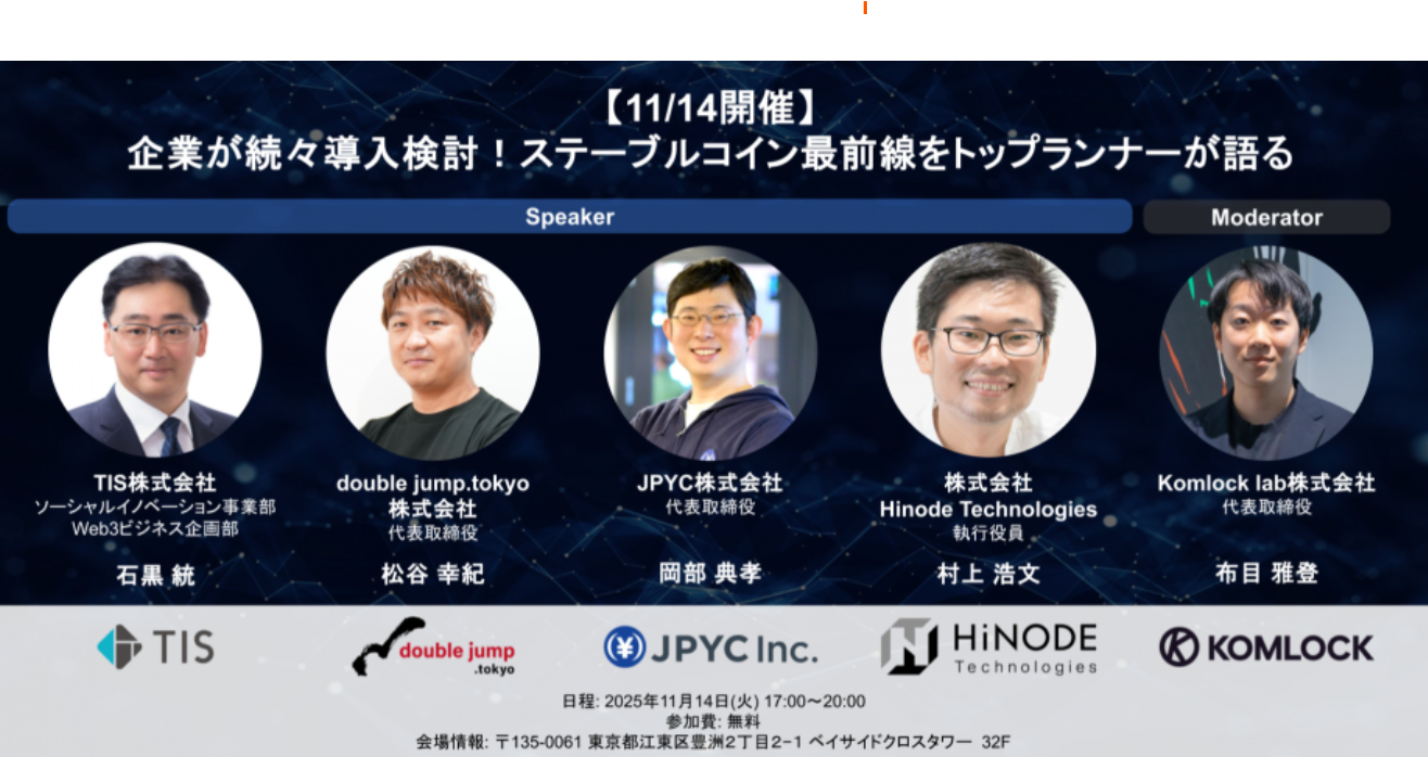 Komlock lab株式会社(所在地:東京都渋谷区、代表取締役社長:布目雅登、以下「Komlock lab」)は、TISインテックグループのTIS株式会社( 所在地:東京都新宿区、代表取締役社長:岡本安史、以下「TIS」)とdouble jump.tokyo株式会社(所在地:東京都新宿区、代表取締役:上野広伸・松谷幸紀、以下「double jump.tokyo」)が共同で開催するステーブルコイン活用をテーマにしたイベントのモデレーターとして登壇します。