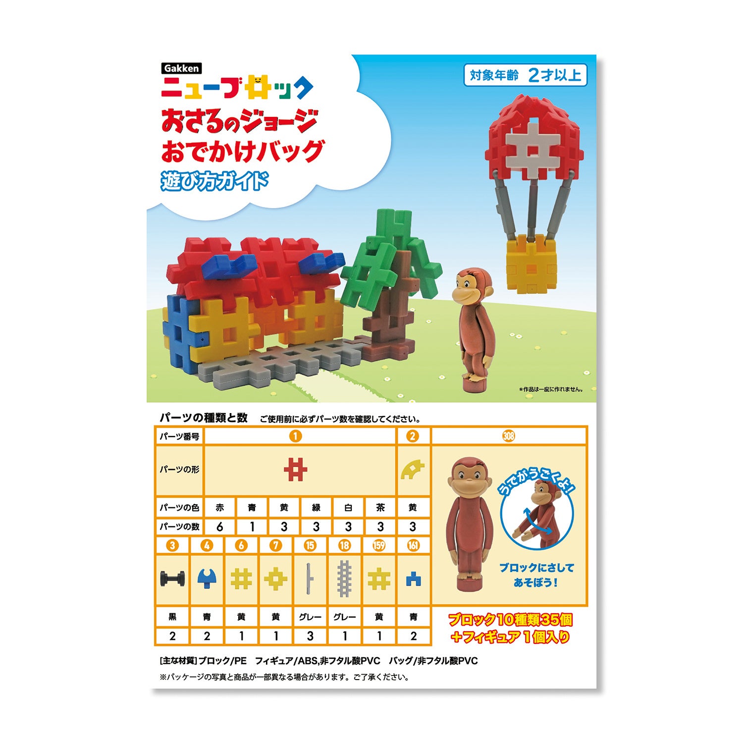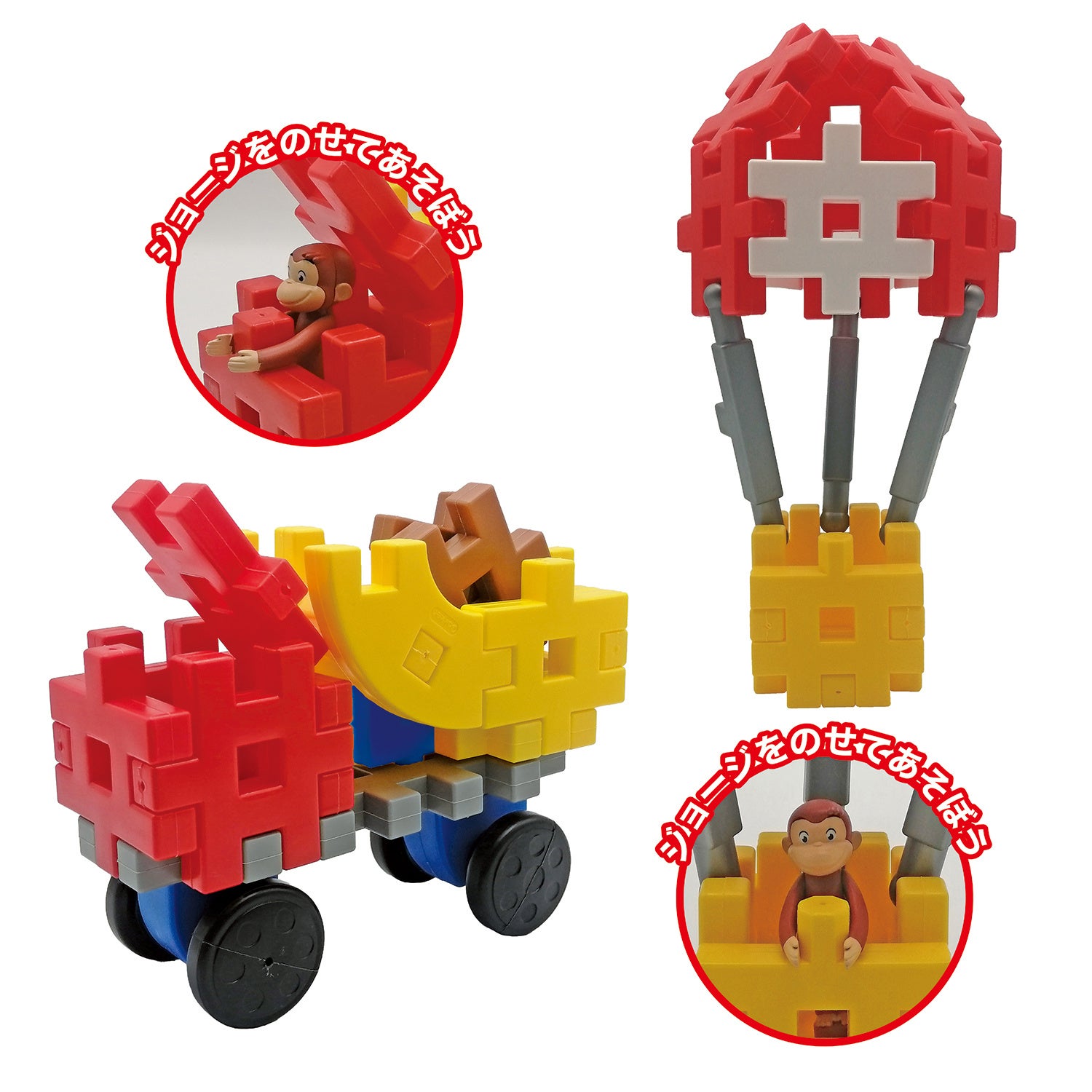 ジョージの物語に登場する気球やトラック、別荘などをブロックで組み立てて、ジョージの世界をブロックでも楽しめるセット。ブロック10種35個と、腕が動かせるジョージのフィギュア1体が入っており、組み立てや、見立て遊び、ごっこ遊びなど様々な遊びができます。