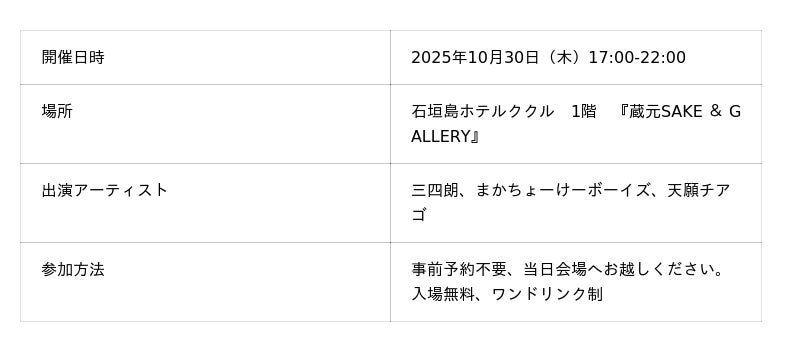 シマダグループの一社であるタイム・アロー八重山株式会社(沖縄県石垣市、代表取締役:中川和紀)は、石垣島の文化とアートの発信拠点である「石垣島ホテルククル」1階の「蔵元SAKE & GALLERY」にて、2025年10月30日(木)17:00より、一夜限りのスペシャルイベント「ハロウィンジャズナイト」を開催いたします。日本のジャズ界を代表するサックス奏者・三四朗氏と、石垣島を拠点に活躍する地元ミュージシャン「まかちょーけーボーイズ」、ピアニストの天願チアゴ氏が共演し、石垣島のハロウィンの夜を彩る、忘れられない音楽体験をお届けします。
