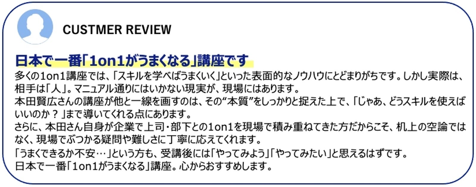 「実践!1on1ミーティング(日本経済新聞出版)」や「1on1ミーティングの極意(ワン・パブリッシング)」の著者である本田賢広は、管理職向けの学習動画『1on1ミーティング実践講座』をリリースした。この度、当該動画が好評で、より多くの方にご覧いただけるよう11月16日まで特別価格、1,500円(税込)での提供を開始した。