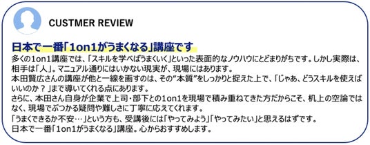 - 延べ2万5千人に提供してきた1on1研修をわずか2.5時間で、好きな時に学べる- メンバーとの信頼関係を構築し、意欲を引き出す1on1ミーティングの本質が理解できる