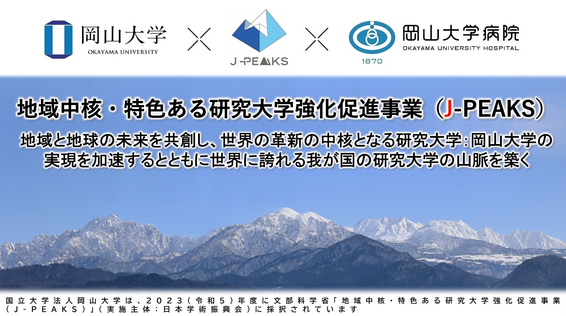 - 岡山大学 文部科学省「地域中核・特色ある研究大学強化促進事業(J-PEAKS)」に採択~地域と地球の未来を共創し、世界の革新の中核となる研究大学:岡山大学の実現を加速とともに世界に誇れる我が国の研究大学の山脈を築く~