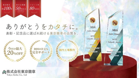 株式会社東京徽章(本社:東京都葛飾区、代表取締役 堀口文人)は、2025年9月より、法人表彰・周年記念・イベント向けに人気の「クリスタルトロフィー」「金箔トロフィー」「表彰楯」など計8商品を対象とした期間限定セールを実施しています。最大20%OFFで提供し、名入れ・デザイン・短納期にも対応。「ありがとう」をカタチにする記念品をお届けします。