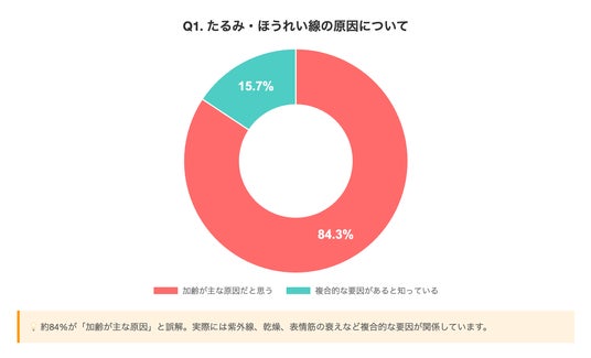 その結果、約84%の方が「加齢が主な原因」と回答し、多くの方が誤った認識を持っていることが分かりました。実際には、紫外線ダメージ、乾燥、表情筋の衰え、姿勢、生活習慣など、複合的な要因が関係しています。
