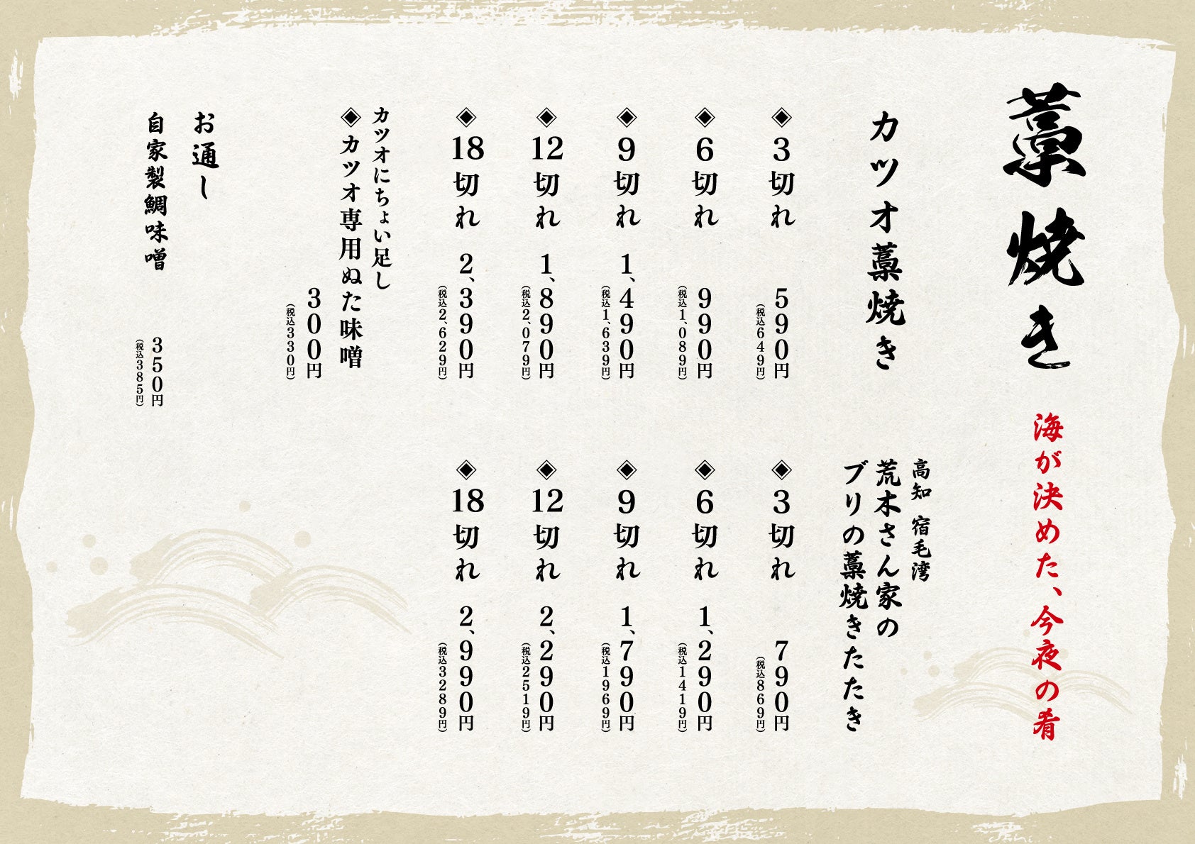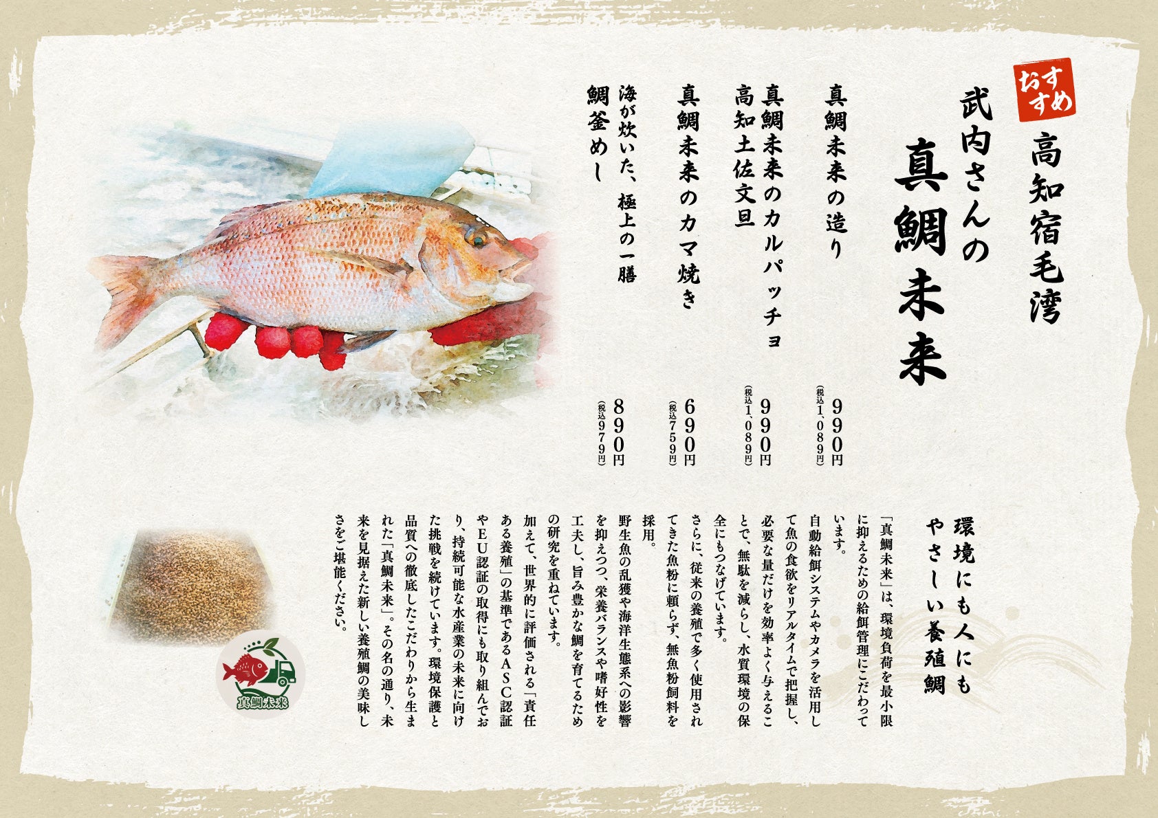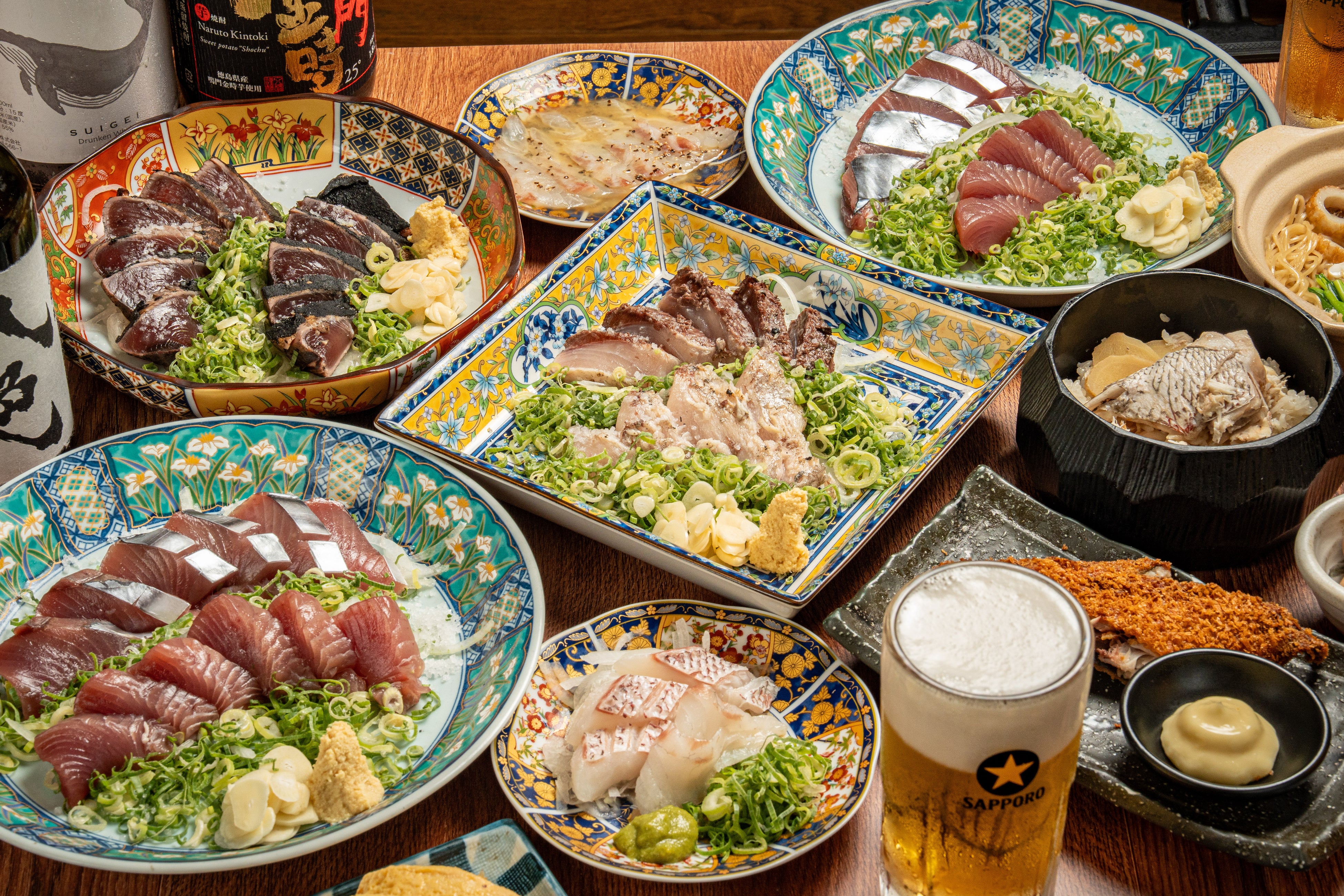 「日帰りカツオ」、「荒木さん家のブリ」、「真鯛未来」、「直七(なおしち)」等の食材それぞれの素材の良さ引き出したメニューを取り揃えました。