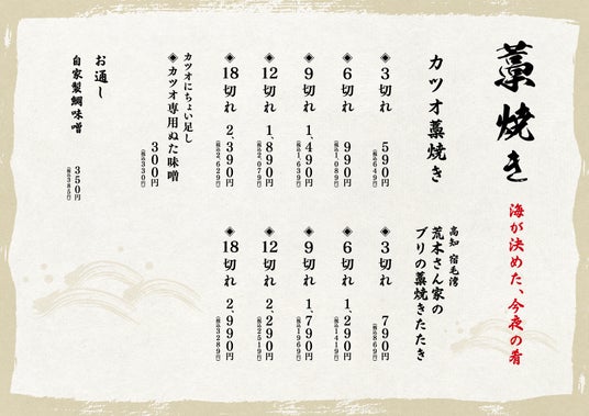 今回の目玉は、愛媛・愛南町深浦港から届く鮮度抜群の「日帰りカツオ」、高知・宿毛湾で育てられた脂のり抜群のブランドブリ「荒木さん家のブリ」、環境に配慮し未来を育む「真鯛未来」、そして幻の柑橘と言われる「直七(なおしち)」。いずれも高知・愛媛の豊かな自然と生産者のこだわりが生んだ逸品です。さらに店舗入り口付近には藁焼き場を設置。臨場感あふれる藁焼きの実演をお楽しみいただけます。